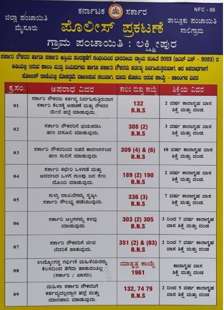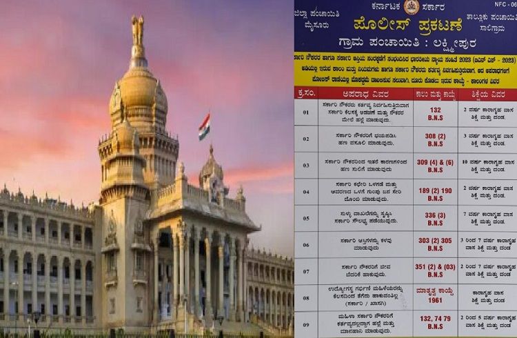 ಬೆಂಗಳೂರು : ಸರ್ಕಾರಿ ನೌಕರರ ಹಾಗೂ ಸರ್ಕಾರಿ ಆಸ್ತಿಯ ಸಂರಕ್ಷಣೆಗೆ ಸಂಭಂದಿಸಿದ ಭಾರತೀಯ ನ್ಯಾಯ ಸಂಹಿತೆ 2023 (ಜಿಎನ್ ಎಸ್ – 2023) ರ ಅಡಿಯಲ್ಲಿ ಇರುವ ಕಾಲಂ ಮತ್ತು ನಿಯಮಗಳು ಹಾಗೂ ಸರ್ಕಾರಿ ನೌಕರರು ಕರ್ತವ್ಯ ನಿರ್ವಹಿಸುತ್ತಿರುವಾಗ, ಆದ ಅಪರಾಧಗಳಿಗೆ ಪೋಲಿಸ್ ಠಾಣೆಯಲ್ಲಿ ಮೊಕದ್ದಮೆ ದಾಖಲಿಸುವ ಸಲುವಾಗಿ, ದೂರು ಕೊಡಲು ಇರುವ ಕಾಯ್ದೆ – ಕಾಲಂಗಳ ವಿವರ.