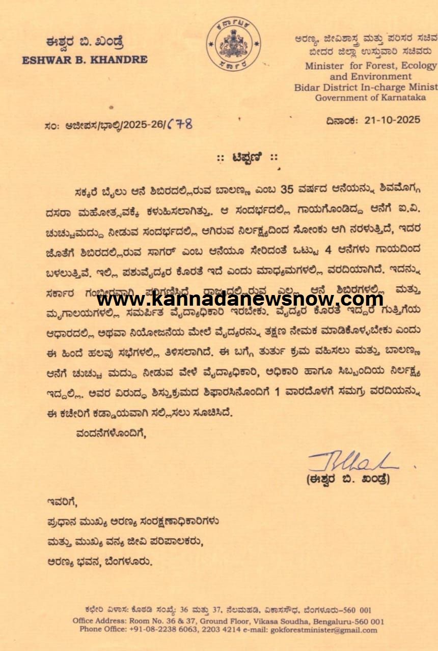 ಈ ಕುರಿತಂತೆ ಪ್ರಧಾನ ಮುಖ್ಯ ಅರಣ್ಯ ಸಂರಕ್ಷಣಾಧಿಕಾರಿಗಳಿಗೆ ಪತ್ರ ಬರೆದಿರುವಂತ ಅವರು, ಸಕ್ಕರೆ ಬೈಲು ಆನೆ ಶಿಬಿರದಲ್ಲಿರುವ ಬಾಲಣ್ಯ ಎಂಬ 35 ವರ್ಷದ ಆನೆಯನ್ನು ಶಿವಮೊಗ್ಗ ದಸರಾ ಮಹೋತ್ಸವಕ್ಕೆ ಕಳುಹಿಸಲಾಗಿತ್ತು. ಆ ಸಂದರ್ಭದಲ್ಲಿ ಗಾಯಗೊಂಡಿದ್ದ ಆನೆಗೆ ಐ.ವಿ. ಚುಚ್ಚುಮದ್ದು ನೀಡುವ ಸಂದರ್ಭದಲ್ಲಿ, ಆಗಿರುವ ನಿರ್ಲಕ್ಷದಿಂದ ಸೋಂಕು ಆಗಿ ನರಳುತ್ತಿದೆ, ಇದರ ಜೊತೆಗೆ ಶಿಬಿರದಲ್ಲಿರುವ ಸಾಗರ್ ಎಂಬ ಆನೆಯೂ ಸೇರಿದಂತೆ ಒಟ್ಟು 4 ಆನೆಗಳು ಗಾಯದಿಂದ ಬಳಲುತ್ತಿವೆ. ಇಲ್ಲಿ ಪಶುವೈದ್ಯರ ಕೊರತೆ ಇದೆ ಎಂದು ಮಾಧ್ಯಮಗಳಲ್ಲಿ ವರದಿಯಾಗಿದೆ ಎಂದಿದ್ದಾರೆ.