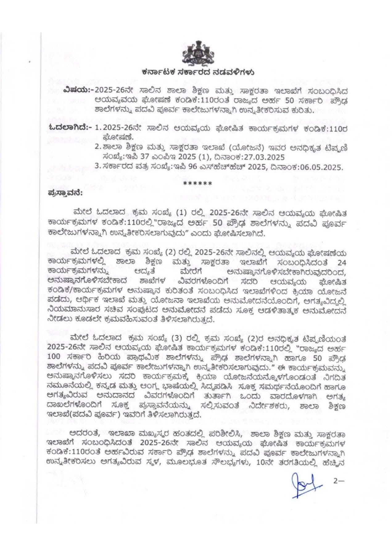 ಬೆಂಗಳೂರು: ಶಾಲಾ ಶಿಕ್ಷಣ ಮತ್ತು ಸಾಕ್ಷರತಾ ಇಲಾಖೆಯು ರಾಜ್ಯದ ಶೈಕ್ಷಣಿಕ ಕ್ಷೇತ್ರದಲ್ಲಿ ಮಹತ್ವದ ಬದಲಾವಣೆಗೆ ಮುಂದಾಗಿದೆ. 2025-26ನೇ ಸಾಲಿನ ಆಯವ್ಯಯ ಘೋಷಣೆಯಂತೆ, ರಾಜ್ಯದ ಅರ್ಹ 50 ಸರ್ಕಾರಿ ಪ್ರೌಢಶಾಲೆಗಳನ್ನು ಪದವಿ ಪೂರ್ವ (PU) ಕಾಲೇಜುಗಳಾಗಿ ಮೇಲ್ದರ್ಜೆಗೇರಿಸಿ ಸರ್ಕಾರ ಆದೇಶ ಹೊರಡಿಸಿದೆ.