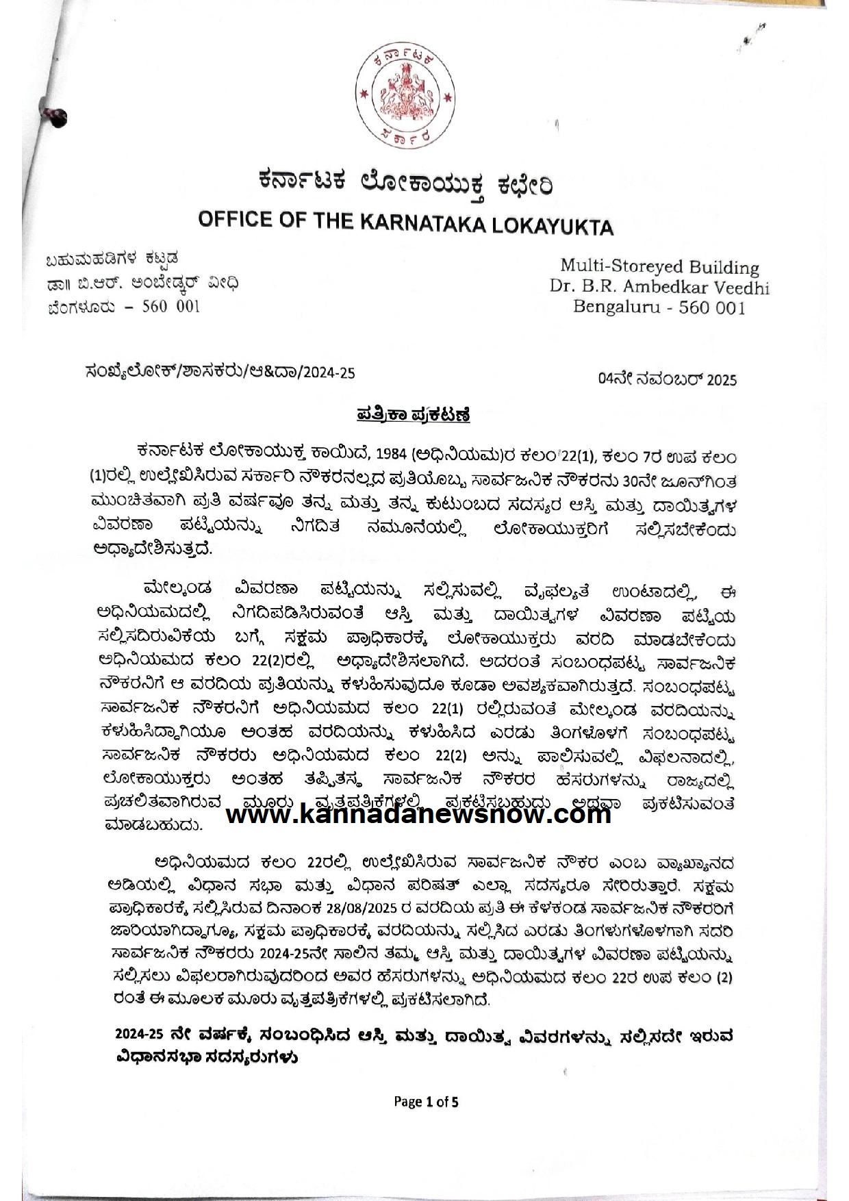 ಅಧಿನಿಯಮದ ಕಲಂ 22ರಲ್ಲಿ ಉಲ್ಲೇಖಿಸಿರುವ ಸಾರ್ವಜನಿಕ ನೌಕರ ಎಂಬ ವ್ಯಾಖ್ಯಾನದ ಅಡಿಯಲ್ಲಿ ವಿಧಾನ ಸಭಾ ಮತ್ತು ವಿಧಾನ ಪರಿಷತ್ ಎಲ್ಲಾ ಸದಸ್ಯರೂ ಸೇರಿರುತ್ತಾರೆ. ಸಕ್ಷಮ ಪ್ರಾಧಿಕಾರಕ್ಕೆ ಸಲ್ಲಿಸಿರುವ ದಿನಾಂಕ 28/08/2025 ರ ವರದಿಯ ಪ್ರತಿ ಈ ಕೆಳಕಂಡ ಸಾರ್ವಜನಿಕ ನೌಕರರಿಗೆ ಜಾರಿಯಾಗಿದ್ದಾಗ್ಯೂ, ಸಕ್ಷಮ ಪ್ರಾಧಿಕಾರಕ್ಕೆ ವರದಿಯನ್ನು ಸಲ್ಲಿಸಿದ ಎರಡು ತಿಂಗಳುಗಳೊಳಗಾಗಿ ಸದರಿ ಸಾರ್ವಜನಿಕ ನೌಕರರು 2024-25ನೇ ಸಾಲಿನ ತಮ್ಮ ಆಸ್ತಿ ಮತ್ತು ದಾಯಿತ್ವಗಳ ವಿವರಣಾ ಪಟ್ಟಿಯನ್ನು ಸಲ್ಲಿಸಲು ವಿಫಲರಾಗಿರುವುದರಿಂದ ಅವರ ಹೆಸರುಗಳನ್ನು ಅಧಿನಿಯಮದ ಕಲಂ 22ರ ಉಪ ಕಲಂ (2) ರಂತೆ ಈ ಮೂಲಕ ಮೂರು ವೃತ್ತಪತ್ರಿಕೆಗಳಲ್ಲಿ ಪುಕಟಿಸಲಾಗಿದೆ ಎಂದಿದೆ.