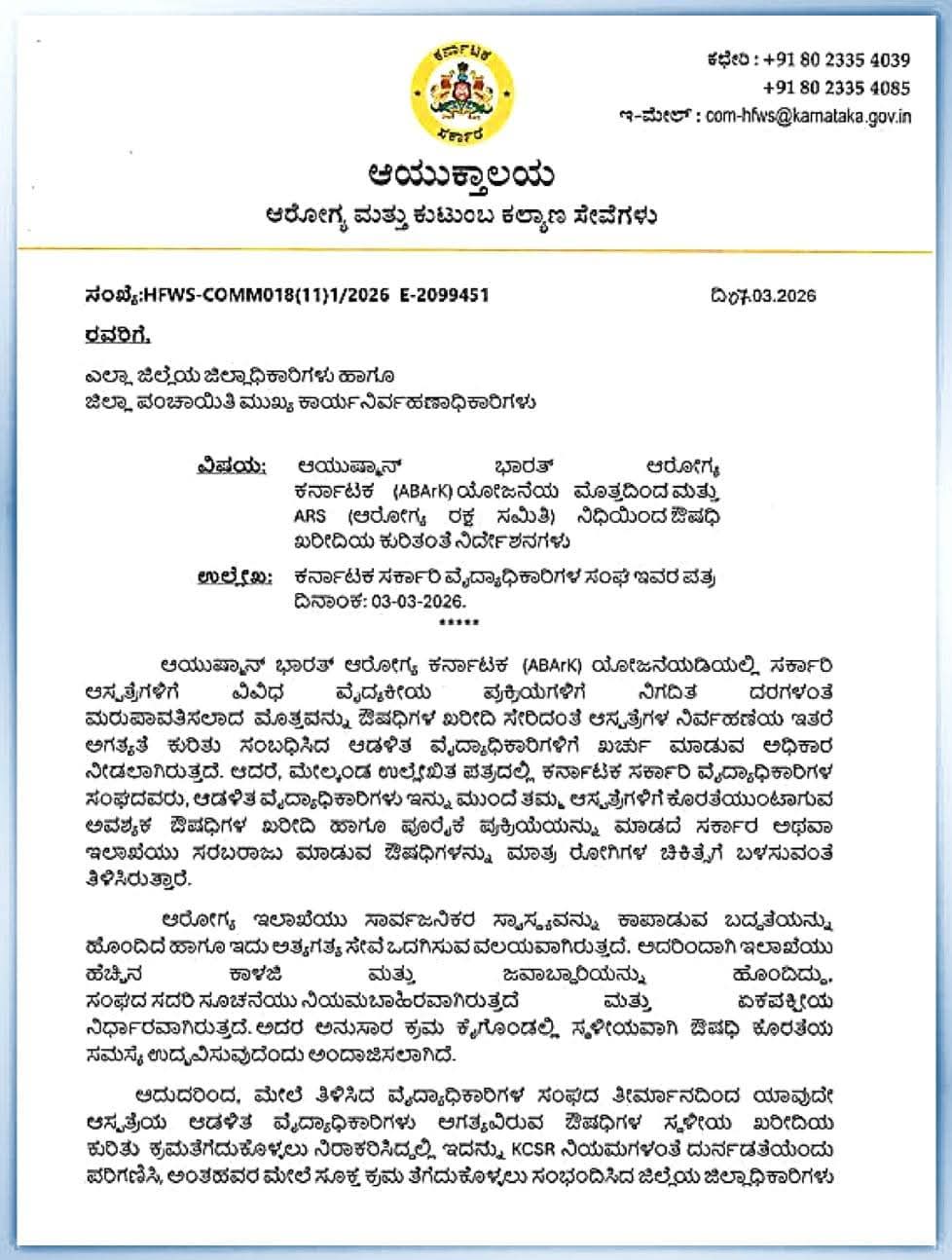 ಸಂಘದ ಪತ್ರಕ್ಕೆ ಸರ್ಕಾರದ ಆಕ್ಷೇಪ: ಇತ್ತೀಚೆಗೆ ಸರ್ಕಾರಿ ವೈದ್ಯಾಧಿಕಾರಿಗಳ ಸಂಘವು “ಸರ್ಕಾರ ಪೂರೈಸುವ ಔಷಧಿಗಳನ್ನು ಮಾತ್ರ ಬಳಸಬೇಕು, ಸ್ಥಳೀಯವಾಗಿ ಖರೀದಿ ಮಾಡಬಾರದು” ಎಂದು ಸೂಚನೆ ನೀಡಿತ್ತು. ಇದನ್ನು ಸರ್ಕಾರವು ‘ನಿಯಮಬಾಹಿರ’ ಮತ್ತು ‘ಏಕಪಕ್ಷೀಯ ನಿರ್ಧಾರ’ ಎಂದು ಕರೆದಿದೆ.