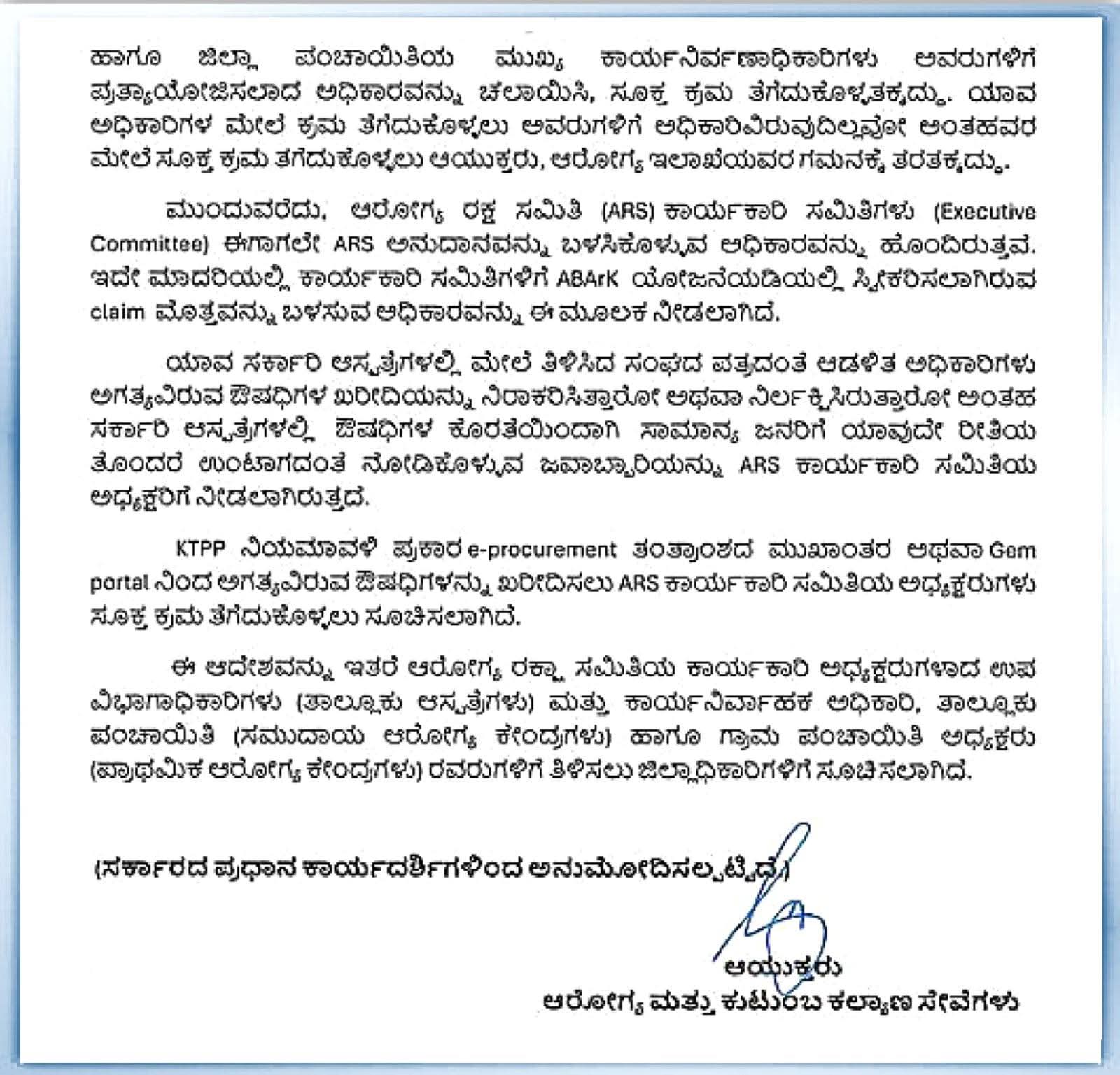 ಸಾರ್ವಜನಿಕರ ಹಿತದೃಷ್ಟಿ: ಔಷಧಿ ಕೊರತೆಯಿಂದ ಜನಸಾಮಾನ್ಯರಿಗೆ ತೊಂದರೆಯಾಗಬಾರದು ಎಂಬ ಉದ್ದೇಶದಿಂದ ಈ ಕಟ್ಟುನಿಟ್ಟಿನ ಕ್ರಮ ಕೈಗೊಳ್ಳಲಾಗಿದೆ. KTPP ನಿಯಮದಂತೆ ಇ-ಪ್ರೊಕ್ಯೂರ್ಮೆಂಟ್ ಅಥವಾ GeM ಪೋರ್ಟಲ್ ಮೂಲಕ ಔಷಧಿ ಖರೀದಿಸಲು ARS ಸಮಿತಿಯ ಅಧ್ಯಕ್ಷರಿಗೆ ಸೂಚಿಸಲಾಗಿದೆ.