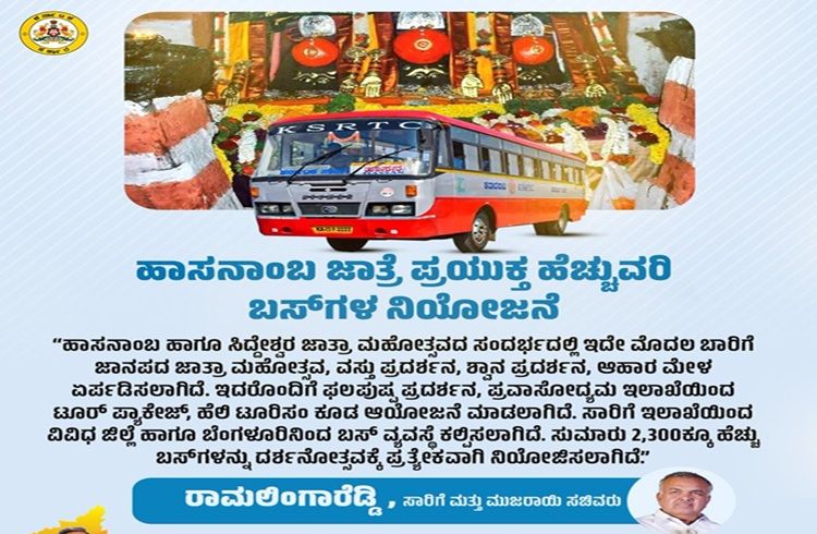 ಬೆಂಗಳೂರು: ಹಾಸನಾಂಬ ಜಾತ್ರೆಗೆ ತೆರಳುವವರಿಗೆ ಗುಡ್ ನ್ಯೂಸ್ ಎನ್ನುವಂತೆ ಸಾರಿಗೆ ಇಲಾಖೆಯಿಂದ ಹೆಚ್ಚುವರಿ ಬಸ್ ಗಳನ್ನು ನಿಯೋಜನೆ ಮಾಡಲಾಗಿದೆ ಎಂಬುದಾಗಿ ಸಾರಿಗೆ ಮತ್ತು ಮುಜರಾಯಿ ಸಚಿವ ರಾಮಲಿಂಗಾರೆಡ್ಡಿ ತಿಳಿಸಿದ್ದಾರೆ.