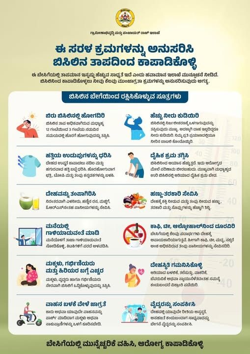 ಹವಾಮಾನ ಇಲಾಖೆಯ ಮುನ್ಸೂಚನೆಯಂತೆ ಈ ಬಾರಿ ಬಿಸಿಲು ತೀವ್ರಗೊಳ್ಳುವ ಸಾಧ್ಯತೆ ಇರುವುದರಿಂದ, ಸಾರ್ವಜನಿಕರು ಕೆಳಕಂಡ ಸರಳ ಕ್ರಮಗಳನ್ನು ಅನುಸರಿಸುವ ಮೂಲಕ ತಮ್ಮ ಆರೋಗ್ಯವನ್ನು ಕಾಪಾಡಿಕೊಳ್ಳಲು ಇಲಾಖೆ ಮನವಿ ಮಾಡಿದೆ.