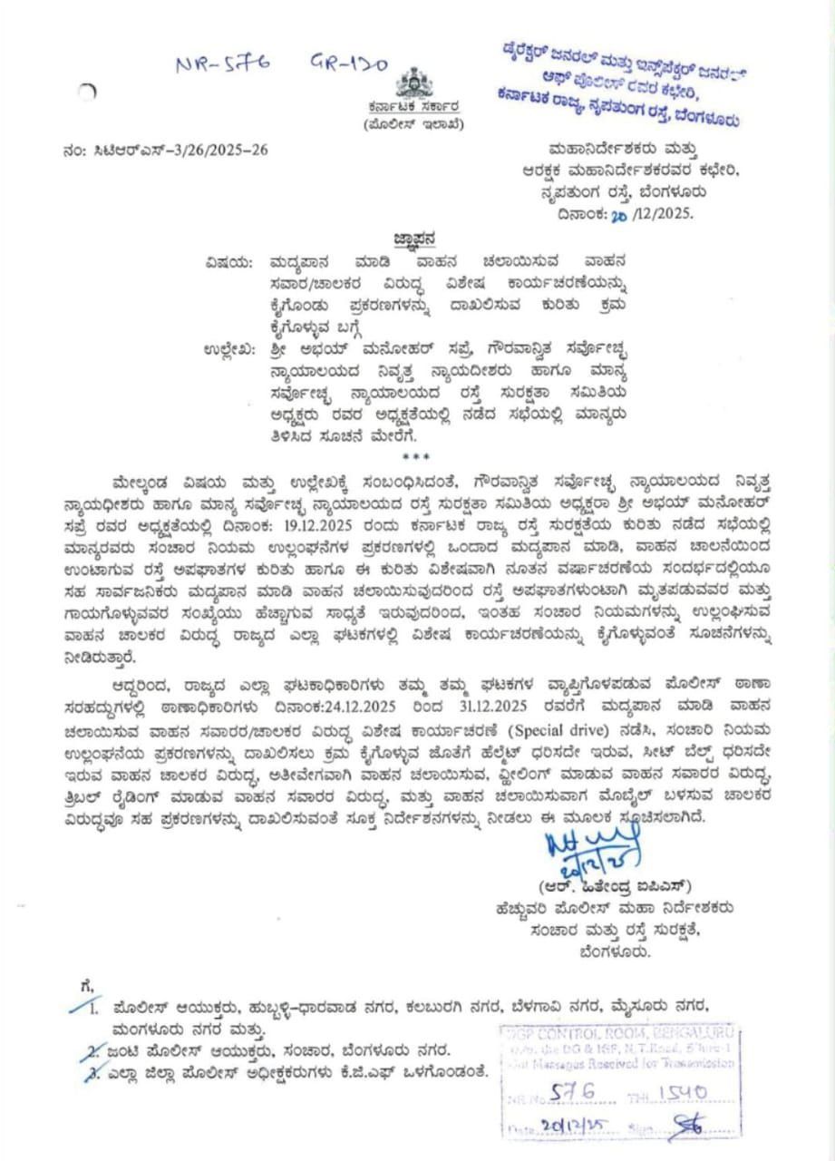 ಮೇಲ್ಕಂಡ ವಿಷಯ ಮತ್ತು ಉಲ್ಲೇಖಕ್ಕೆ ಸಂಬಂಧಿಸಿದಂತೆ, ಗೌರವಾನ್ವಿತ ಸರ್ವೋಚ್ಛ ನ್ಯಾಯಾಲಯದ ನಿವೃತ್ತ ನ್ಯಾಯಧೀಶರು ಹಾಗೂ ಮಾನ್ಯ ಸರ್ವೋಚ್ಛ ನ್ಯಾಯಾಲಯದ ರಸ್ತೆ ಸುರಕ್ಷತಾ ಸಮಿತಿಯ ಅಧ್ಯಕ್ಷರಾ ಶ್ರೀ ಅಭಯ್ ಮನೋಹರ್ ಸಪ್ರೆ ರವರ ಅಧ್ಯಕ್ಷತೆಯಲ್ಲಿ ದಿನಾಂಕ: 19.12.2025 ರಂದು ಕರ್ನಾಟಕ ರಾಜ್ಯ ರಸ್ತೆ ಸುರಕ್ಷತೆಯ ಕುರಿತು ನಡೆದ ಸಭೆಯಲ್ಲಿ ಮಾನ್ಯರವರು ಸಂಚಾರ ನಿಯಮ ಉಲ್ಲಂಘನೆಗಳ ಪ್ರಕರಣಗಳಲ್ಲಿ ಒಂದಾದ ಮದ್ಯಪಾನ ಮಾಡಿ, ವಾಹನ ಚಾಲನೆಯಿಂದ ಉಂಟಾಗುವ ರಸ್ತೆ ಅಪಘಾತಗಳ ಕುರಿತು ಹಾಗೂ ಈ ಕುರಿತು ವಿಶೇಷವಾಗಿ ನೂತನ ವರ್ಷಾಚರಣೆಯ ಸಂದರ್ಭದಲ್ಲಿಯೂ ಸಹ ಸಾರ್ವಜನಿಕರು ಮದ್ಯಪಾನ ಮಾಡಿ ವಾಹನ ಚಲಾಯಿಸುವುದರಿಂದ ರಸ್ತೆ ಅಪಘಾತಗಳುಂಟಾಗಿ ಮೃತಪಡುವವರ ಮತ್ತು ಗಾಯಗೊಳ್ಳುವವರ ಸಂಖ್ಯೆಯು ಹೆಚ್ಚಾಗುವ ಸಾಧ್ಯತೆ ಇರುವುದರಿಂದ, ಇಂತಹ ಸಂಚಾರ ನಿಯಮಗಳನ್ನು ಉಲ್ಲಂಘಿಸುವ ವಾಹನ ಚಾಲಕರ ವಿರುದ್ಧ ರಾಜ್ಯದ ಎಲ್ಲಾ ಘಟಕಗಳಲ್ಲಿ ವಿಶೇಷ ಕಾರ್ಯಚರಣೆಯನ್ನು ಕೈಗೊಳ್ಳುವಂತೆ ಸೂಚನೆಗಳನ್ನು ನೀಡಿರುತ್ತಾರೆ.