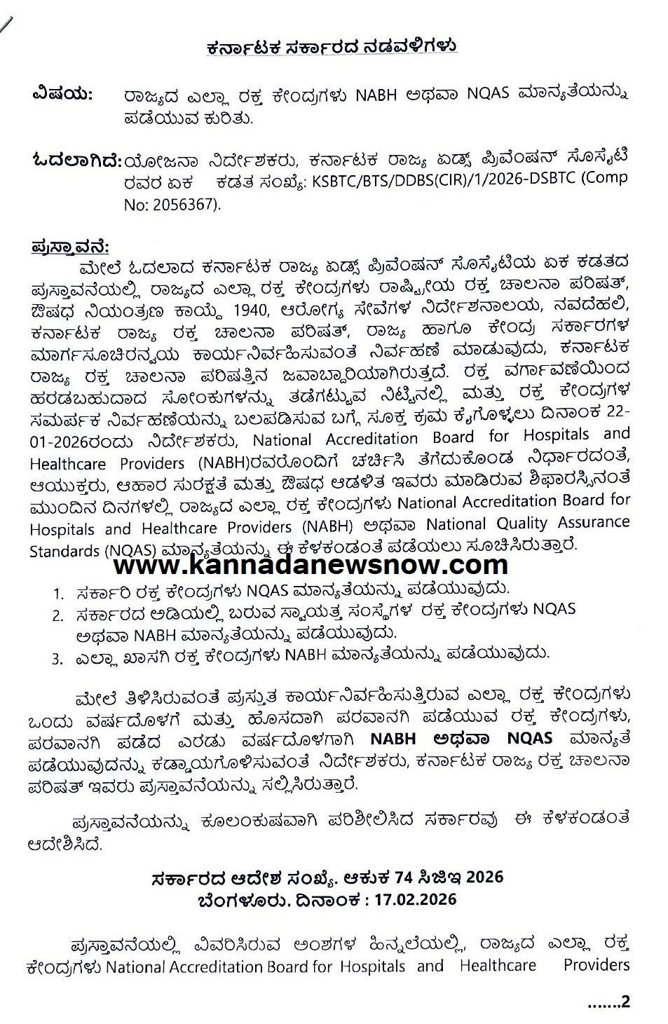 ರಕ್ತ ವರ್ಗಾವಣೆಯಿಂದ ಹರಡಬಹುದಾದ ಸೋಂಕುಗಳನ್ನು ತಡೆಗಟ್ಟುವ ನಿಟ್ಟಿನಲ್ಲಿ ಮತ್ತು ರಕ್ತ ಕೇಂದ್ರಗಳ ಸಮರ್ಪಕ ನಿರ್ವಹಣೆಯನ್ನು ಬಲಪಡಿಸುವ ಬಗ್ಗೆ ಸೂಕ್ತ ಕ್ರಮ ಕೈಗೊಳ್ಳಲು ದಿನಾಂಕ 22- 01-202600 F), National Accreditation Board for Hospitals and Healthcare Providers (NABH)ರವರೊಂದಿಗೆ ಚರ್ಚಿಸಿ ತೆಗೆದುಕೊಂಡ ನಿರ್ಧಾರದಂತೆ, ಆಯುಕ್ತರು, ಆಹಾರ ಸುರಕ್ಷತೆ ಮತ್ತು ಔಷಧ ಆಡಳಿತ ಇವರು ಮಾಡಿರುವ ಶಿಫಾರಸ್ಸಿನಂತೆ ಮುಂದಿನ ದಿನಗಳಲ್ಲಿ ರಾಜ್ಯದ ಎಲ್ಲಾ ರಕ್ತ ಕೇಂದ್ರಗಳು National Accreditation Board for Hospitals and Healthcare Providers (NABH) National Quality Assurance Standards (NQAS) ಮಾನ್ಯತೆಯನ್ನು ಈ ಕೆಳಕಂಡಂತೆ ಪಡೆಯಲು ಸೂಚಿಸಿರುತ್ತಾರೆ ಎಂದು ಹೇಳಿದ್ದಾರೆ.