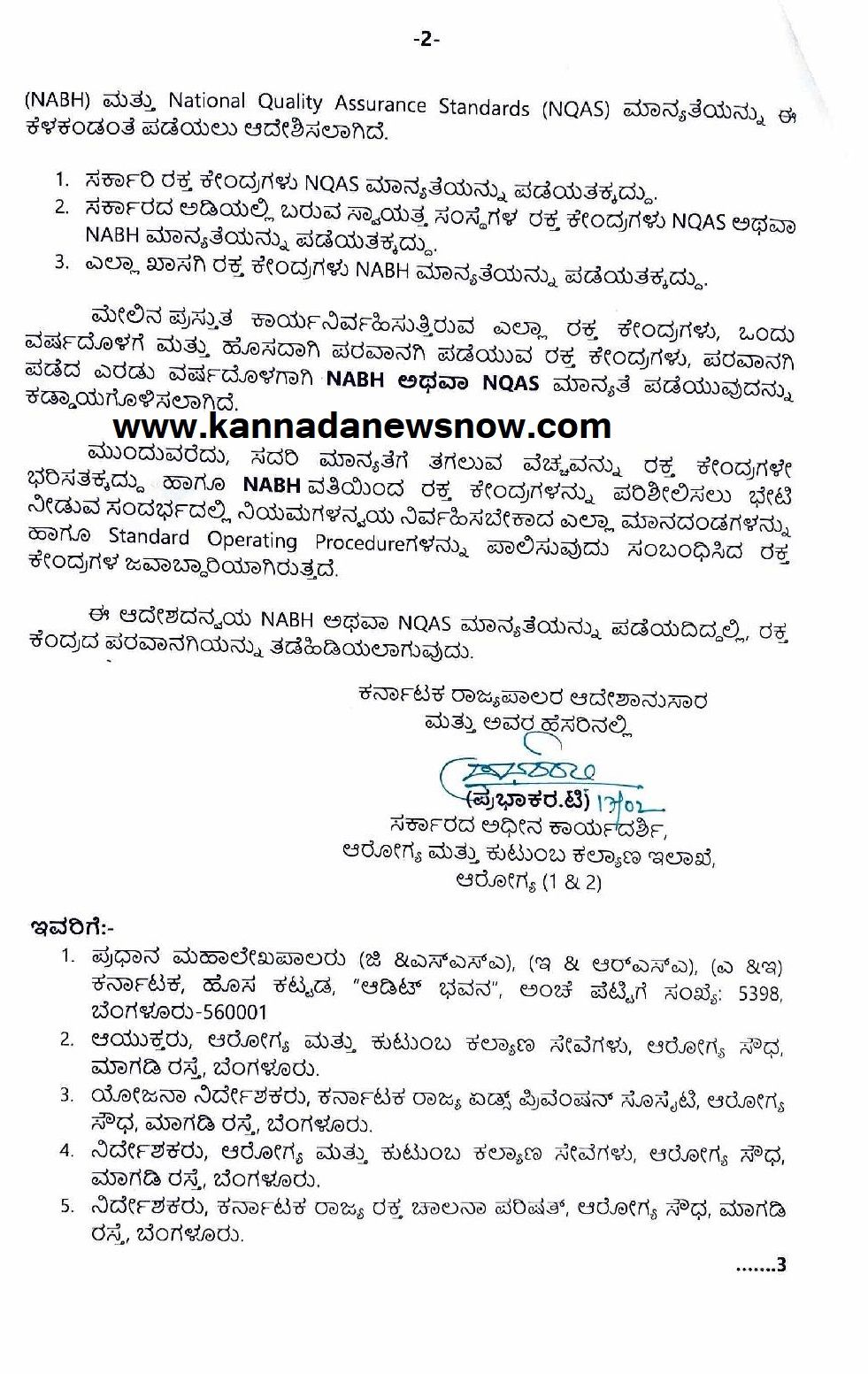 ಈ ಆದೇಶದನ್ವಯ NABH ಅಥವಾ NQAS ಮಾನ್ಯತೆಯನ್ನು ಪಡೆಯದಿದ್ದಲ್ಲಿ, ರಕ್ತ ಕೆಂದ್ರದ ಪರವಾನಗಿಯನ್ನು ತಡೆಹಿಡಿಯಲಾಗುವುದು ಎಂಬುದಾಗಿ ಎಚ್ಚರಿಸಿದ್ದಾರೆ.