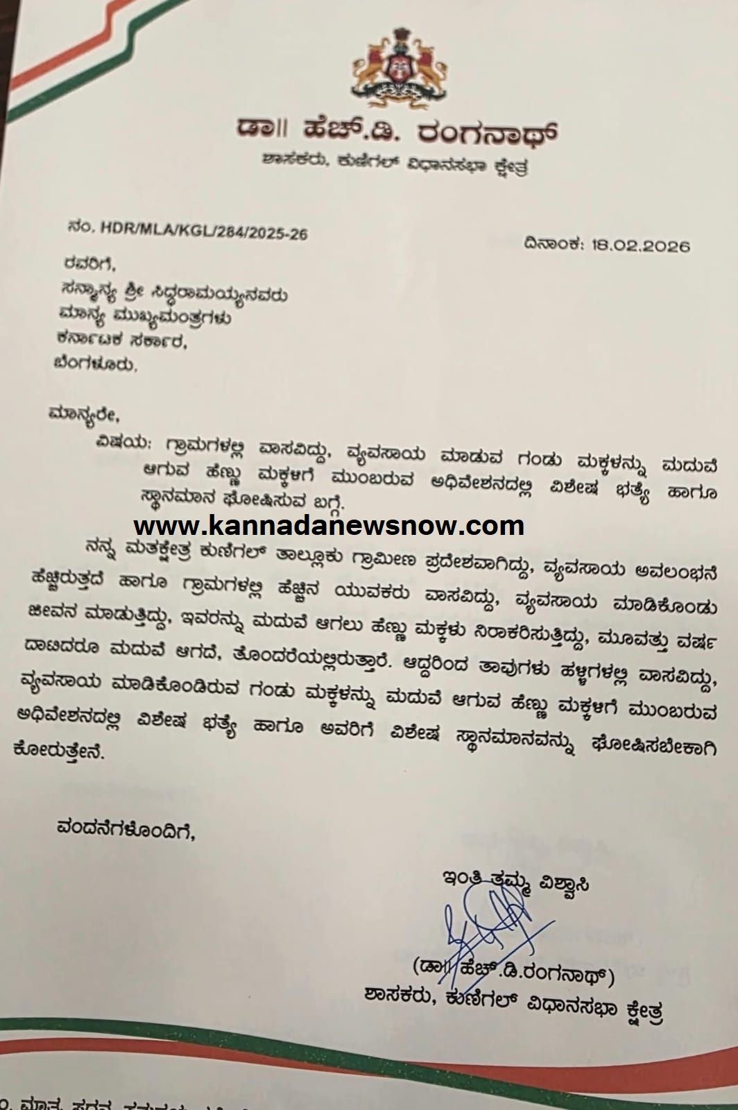 ಈ ಕುರಿತಂತೆ ಸಿಎಂ ಸಿದ್ಧರಾಮಯ್ಯ ಅವರಿಗೆ ಪತ್ರ ಬರೆದಿರುವಂತ ಕುಣಿಗಲ್ ವಿಧಾನಸಭಾ ಕ್ಷೇತ್ರದ ಶಾಸಕ ಡಾ.ಹೆಚ್.ಡಿ ರಂಗನಾಥ್ ಅವರು, ನನ್ನ ಮತಕ್ಷೇತ್ರ ಕುಣಿಗಲ್ ತಾಲ್ಲೂಕು ಗ್ರಾಮೀಣ ಪ್ರದೇಶವಾಗಿದ್ದು, ವ್ಯವಸಾಯ ಅವಲಂಭನೆ ಹೆಚ್ಚಿರುತ್ತದೆ ಹಾಗೂ ಗ್ರಾಮಗಳಲ್ಲಿ ಹೆಚ್ಚಿನ ಯುವಕರು ವಾಸವಿದ್ದು, ವ್ಯವಸಾಯ ಮಾಡಿಕೊಂಡು ಜೀವನ ಮಾಡುತ್ತಿದ್ದು, ಇವರನ್ನು ಮದುವೆ ಆಗಲು ಹೆಣ್ಣು ಮಕ್ಕಳು ನಿರಾಕರಿಸುತ್ತಿದ್ದು, ಮೂವತ್ತು ವರ್ಷ ದಾಟದರೂ ಮದುವೆ ಆಗದೆ, ತೊಂದರೆಯಲ್ಲಿರುತ್ತಾರೆ ಎಂಬುದಾಗಿ ಅಲವತ್ತುಕೊಂಡಿದ್ದಾರೆ.