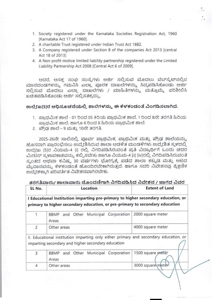 2025-26ನೇ ಸಾಲಿನಲ್ಲಿ ಪೂರ್ವ ಪ್ರಾಥಮಿಕ, ಪ್ರಾಥಮಿಕ ಮತ್ತು ಪ್ರೌಢ ಶಾಲೆಯನ್ನು ಹೊಸದಾಗಿ ಪ್ರಾರಂಭಿಸಲು ಉದ್ದೇಶಿಸಿರುವ ಶಾಲಾ ಆಡಳಿತ ಮಂಡಳಿಗಳು ಉದ್ದೇಶಿತ ಸ್ಥಳದಲ್ಲಿ ಉಲ್ಲೇಖ [5]ರ ನಿಯಮ-4 [i] ರಲ್ಲಿ ನಿಗದಿಪಡಿಸಿರುವಂತೆ ಪ್ರತಿ ವಿದ್ಯಾರ್ಥಿಗೆ ಒಂದು ಚದರ ಮೀಟರ್ ಸ್ಥಳಾವಕಾಶವನ್ನು ಕಲ್ಪಿಸಬೇಕು ಹಾಗೂ ನಿಯಮ-4 [i] [iv]ರಲ್ಲಿ ನಿಗದಿಪಡಿಸಿರುವಂತೆ ಸ್ವಂತದ ಅಥವಾ ಕನಿಷ್ಟ 30 ವರ್ಷಗಳು ಭೋಗ್ಯಕ್ಕೆ ಪಡೆದ ಶಾಲಾ ಕಟ್ಟಡ ಮತ್ತು ಆಟದ ಮೈದಾನವನ್ನು ಕೆಳಕಂಡಂತೆ ಹೊಂದಿರಬೇಕಾಗಿರುತ್ತದೆ. ಹಾಗೂ ಸದರಿ ನಿವೇಶನವು ಶೈಕ್ಷಣಿಕ ಉದ್ದೇಶಕ್ಕಾಗಿ ಪರಿವರ್ತಿತ ನಿವೇಶನವಾಗಿರಬೇಕು.