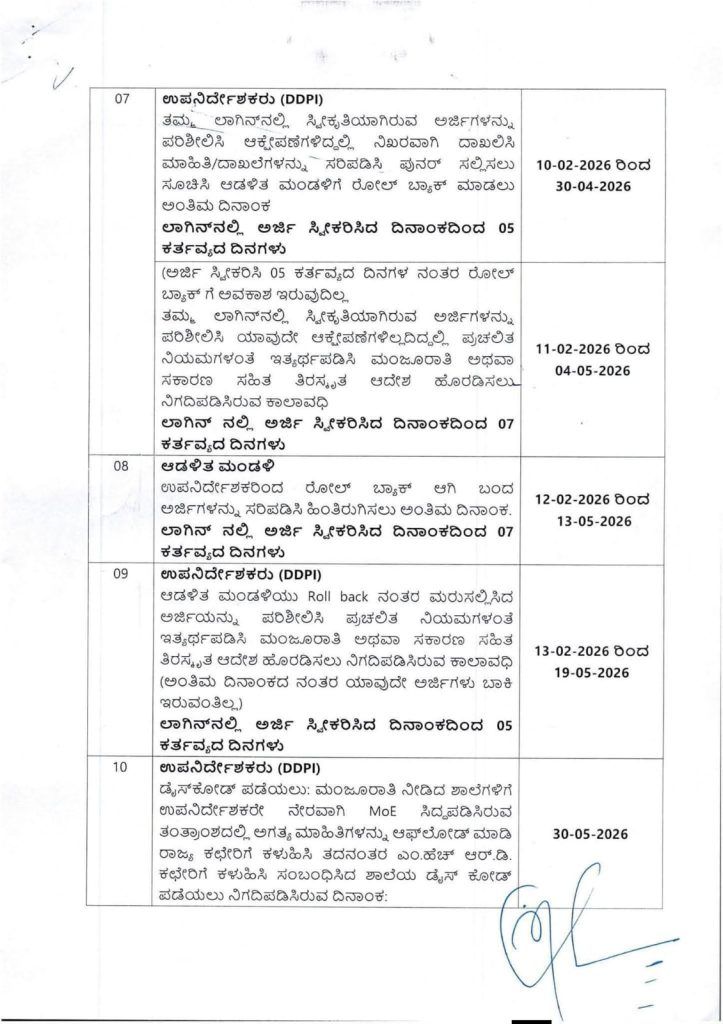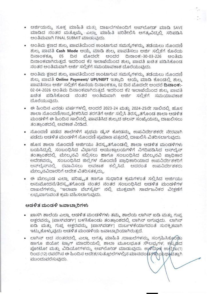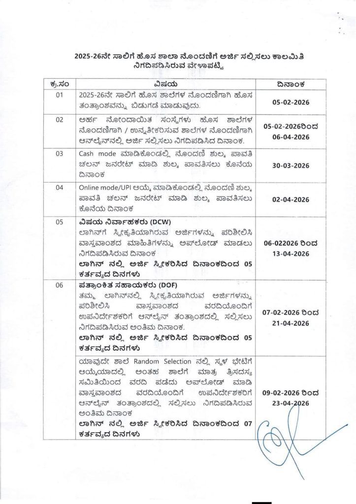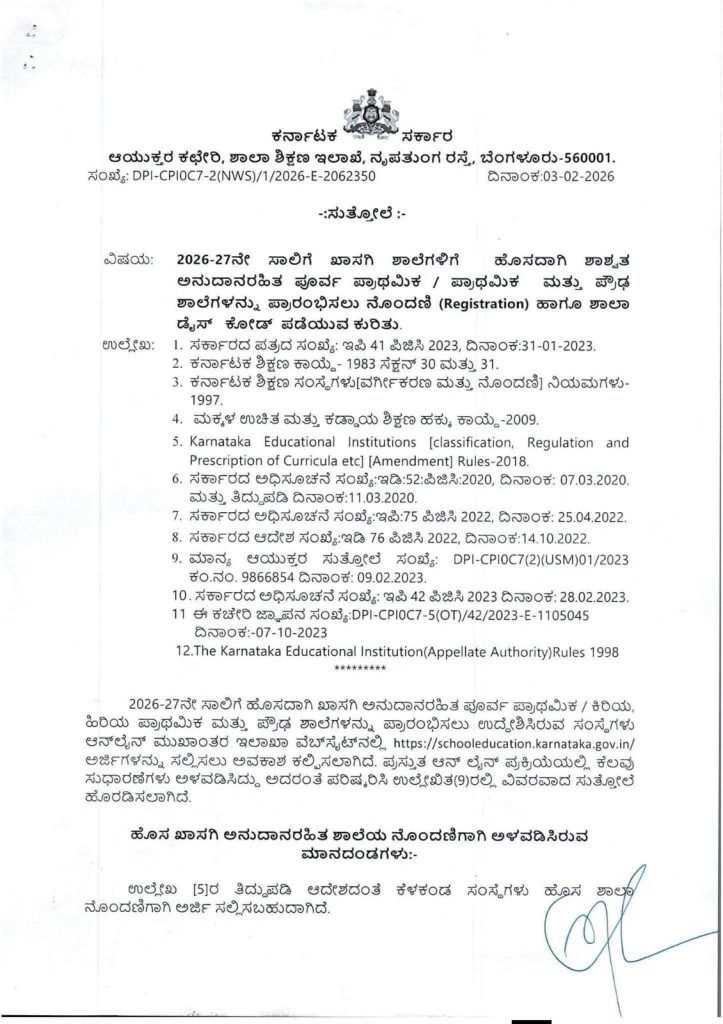 2026-27ನೇ ಸಾಲಿಗೆ ಹೊಸದಾಗಿ ಖಾಸಗಿ ಅನುದಾನರಹಿತ ಪೂರ್ವ ಪ್ರಾಥಮಿಕ / ಕಿರಿಯ, ಹಿರಿಯ ಪ್ರಾಥಮಿಕ ಮತ್ತು ಪ್ರೌಢ ಶಾಲೆಗಳನ್ನು ಪ್ರಾರಂಭಿಸಲು ಉದ್ದೇಶಿಸಿರುವ ಸಂಸ್ಥೆಗಳು https://schooleducation.karnataka.gov.in/ಅರ್ಜಿಗಳನ್ನು ಸಲ್ಲಿಸಲು ಅವಕಾಶ ಕಲ್ಪಿಸಲಾಗಿದೆ. ಪ್ರಸ್ತುತ ಆನ್ ಲೈನ್ ಪ್ರಕ್ರಿಯೆಯಲ್ಲಿ ಕೆಲವು ಸುಧಾರಣೆಗಳು ಅಳವಡಿಸಿದ್ದು ಅದರಂತೆ ಪರಿಷ್ಕರಿಸಿ ಉಲ್ಲೇಖಿತ(9)ರಲ್ಲಿ ವಿವರವಾದ ಸುತ್ತೋಲೆ ಹೊರಡಿಸಲಾಗಿದೆ.