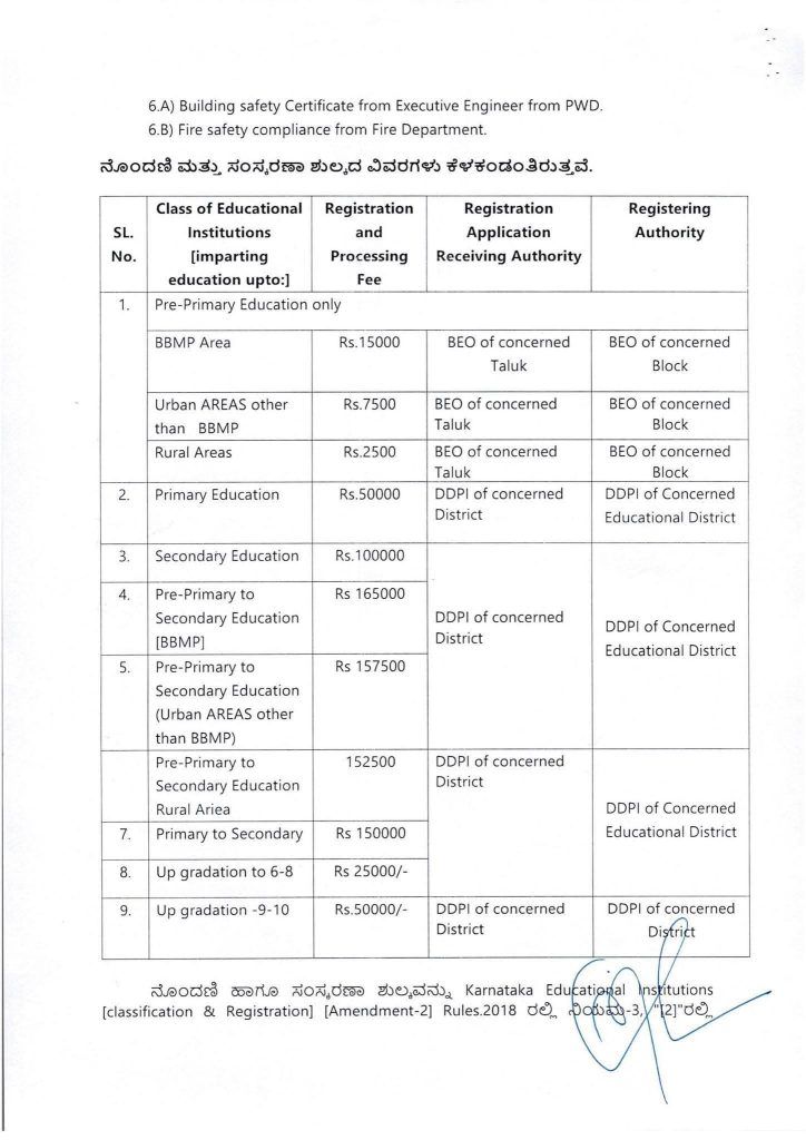 ಹೊಸ ಶಾಲೆಗಳು ಕಡ್ಡಾಯವಾಗಿ ಪಿಡಬ್ಲ್ಯೂಡಿ (PWD) ಇಲಾಖೆಯಿಂದ ಕಟ್ಟಡ ಸುರಕ್ಷತಾ ಪ್ರಮಾಣಪತ್ರ ಮತ್ತು ಅಗ್ನಿಶಾಮಕ ಇಲಾಖೆಯಿಂದ ಸುರಕ್ಷತಾ ಪ್ರಮಾಣಪತ್ರವನ್ನು ಹೊಂದಿರಬೇಕು.