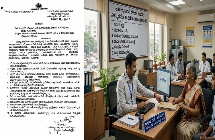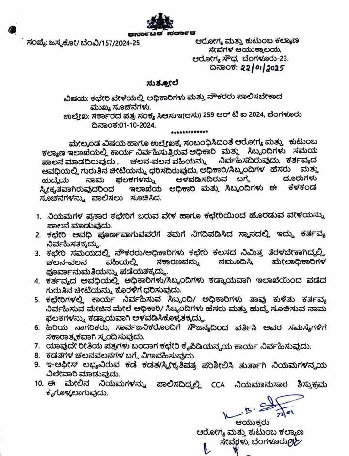 ಬೆಂಗಳೂರು: ಆರೋಗ್ಯ ಮತ್ತು ಕುಟುಂಬ ಕಲ್ಯಾಣ ಇಲಾಖೆಯ ಕಚೇರಿಗಳಲ್ಲಿ ಕಾರ್ಯನಿರ್ವಹಿಸುವ ಅಧಿಕಾರಿಗಳು ಮತ್ತು ನೌಕರರು ಇನ್ನು ಮುಂದೆ ಕಟ್ಟುನಿಟ್ಟಾದ ಶಿಸ್ತು ಪಾಲಿಸುವುದು ಕಡ್ಡಾಯವಾಗಿದೆ. ಈ ಸಂಬಂಧ ಇಲಾಖೆಯ ಆಯುಕ್ತರು ಅಧಿಕೃತ ಸುತ್ತೋಲೆಯನ್ನು ಹೊರಡಿಸಿದ್ದು, ನಿಯಮ ಮೀರುವವರ ವಿರುದ್ಧ ಕಠಿಣ ಕ್ರಮದ ಎಚ್ಚರಿಕೆ ನೀಡಿದ್ದಾರೆ.