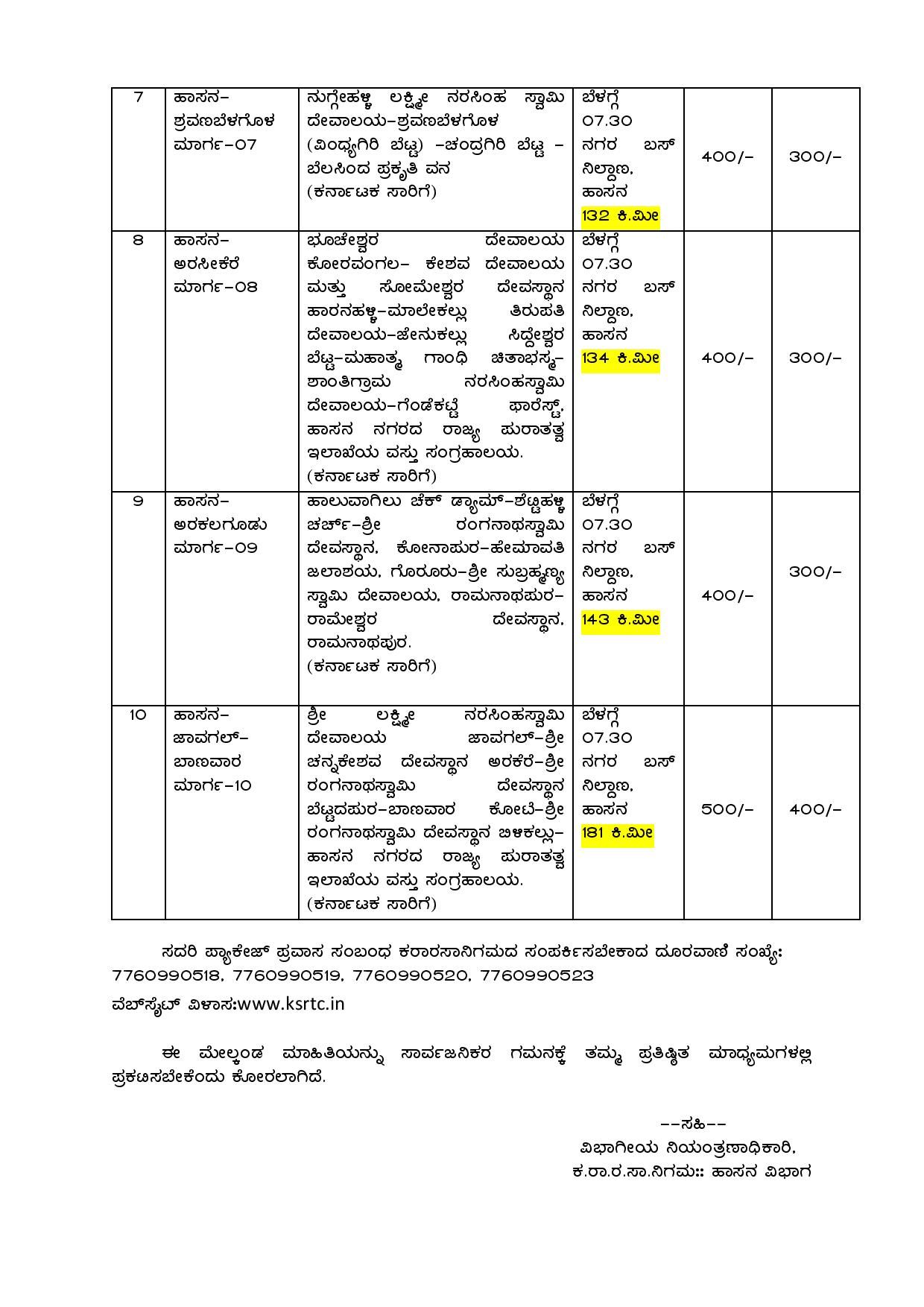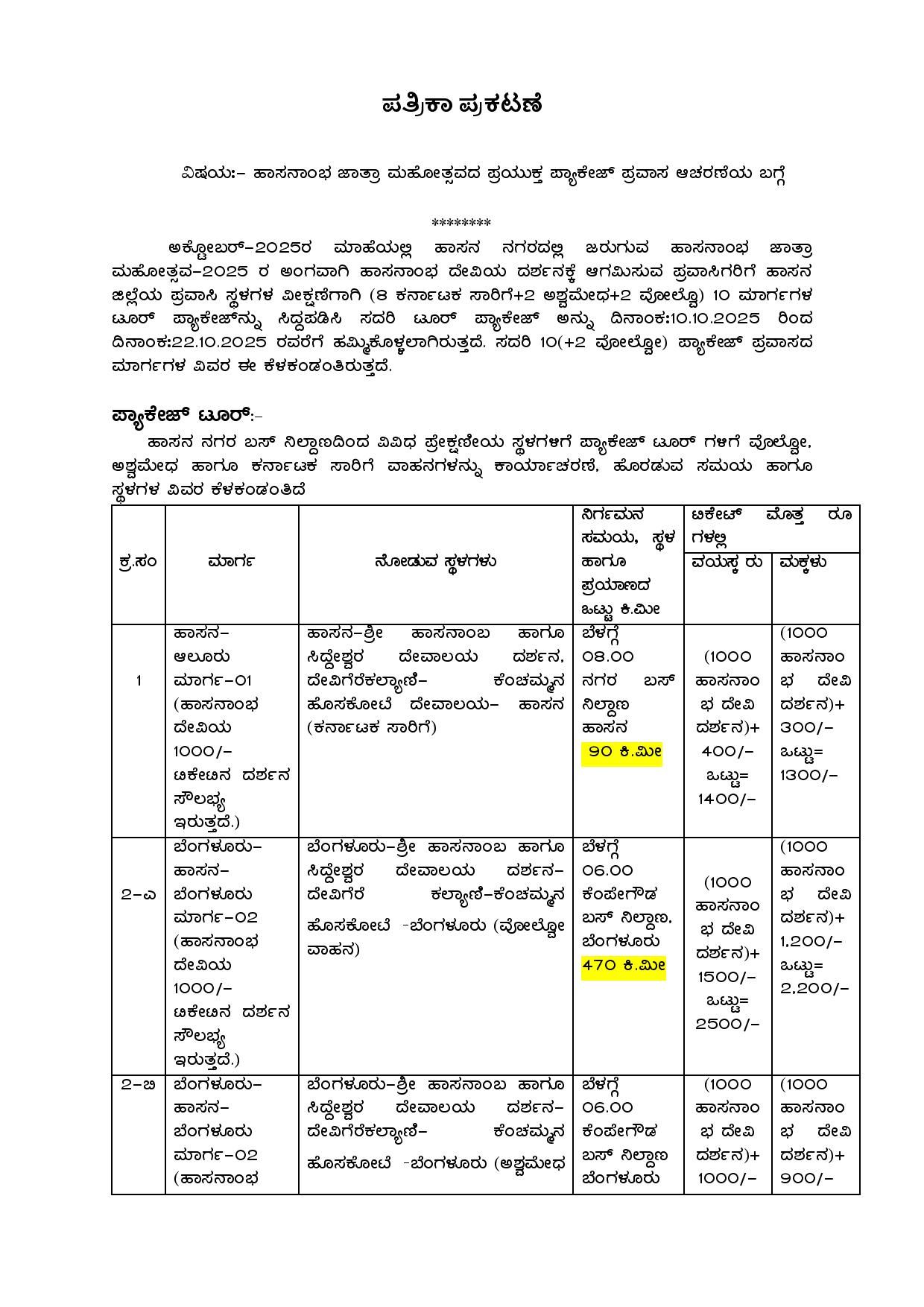 ಈ ಕುರಿತಂತೆ ಪತ್ರಿಕಾ ಪ್ರಕಟಣೆಯಲ್ಲಿ ಮಾಹಿತಿ ನೀಡಿದ್ದು, ಅಕ್ಟೋಬರ್-2025ರ ಮಾಹೆಯಲ್ಲಿ ಹಾಸನ ನಗರದಲ್ಲಿ ಜರುಗುವ ಹಾಸನಾಂಭ ಜಾತ್ರಾ ಮಹೋತ್ಸವ-2025 ರ ಅಂಗವಾಗಿ ಹಾಸನಾಂಭ ದೇವಿಯ ದರ್ಶನಕ್ಕೆ ಆಗಮಿಸುವ ಪ್ರವಾಸಿಗರಿಗೆ ಹಾಸನ ಜಿಲ್ಲೆಯ ಪ್ರವಾಸಿ ಸ್ಥಳಗಳ ವೀಕ್ಷಣೆಗಾಗಿ (8 ಕರ್ನಾಟಕ ಸಾರಿಗೆ+2 ಅಶ್ವಮೇಧ+2 ವೋಲ್ವೊ) 10 ಮಾರ್ಗಗಳ ಟೂರ್ ಪ್ಯಾಕೇಜ್ನ್ನು ಸಿದ್ದಪಡಿಸಿ ಸದರಿ ಟೂರ್ ಪ್ಯಾಕೇಜ್ ಅನ್ನು ದಿನಾಂಕ:10.10.2025 ರಿಂದ ದಿನಾಂಕ:22.10.2025 ರವರೆಗೆ ಹಮ್ಮಿಕೊಳ್ಳಲಾಗಿರುತ್ತದೆ. ಸದರಿ 10(+2 ವೋಲ್ವೋ) ಪ್ಯಾಕೇಜ್ ಪ್ರವಾಸದ ಮಾರ್ಗಗಳ ವಿವರ ಈ ಕೆಳಕಂಡಂತಿರುತ್ತದೆ.