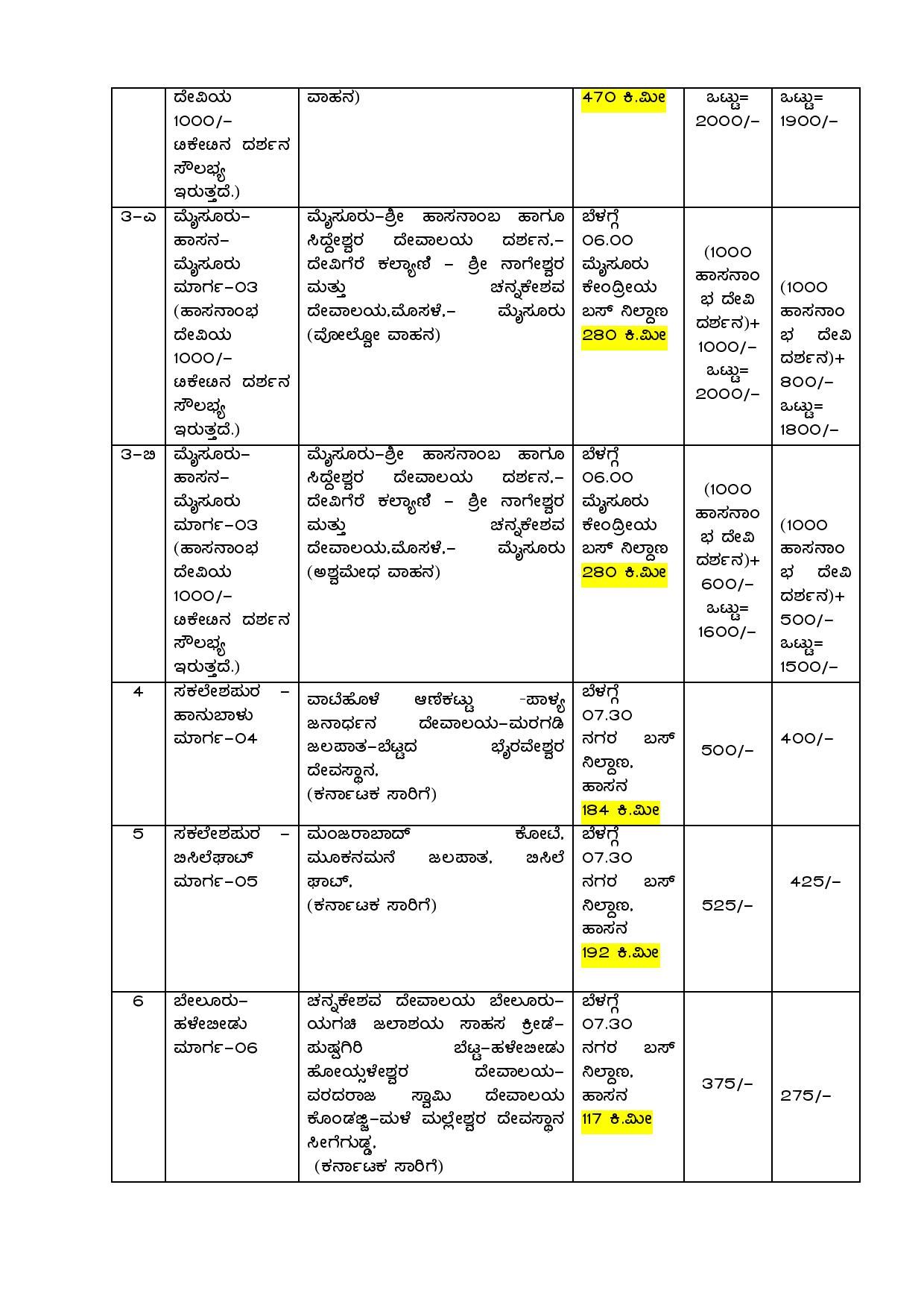 ಹಾಸನ ನಗರ ಬಸ್ ನಿಲ್ದಾಣದಿಂದ ವಿವಿಧ ಪ್ರೇಕ್ಷಣೀಯ ಸ್ಥಳಗಳಿಗೆ ಪ್ಯಾಕೇಜ್ ಟೂರ್ ಗಳಿಗೆ ವೊಲ್ವೋ, ಅಶ್ವಮೇಧ ಹಾಗೂ ಕರ್ನಾಟಕ ಸಾರಿಗೆ ವಾಹನಗಳನ್ನು ಕಾರ್ಯಾಚರಣೆ, ಹೊರಡುವ ಸಮಯ ಹಾಗೂ ಸ್ಥಳಗಳ ವಿವರ ಕೆಳಕಂಡಂತಿದೆ.