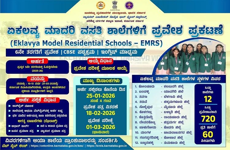 ಬೆಂಗಳೂರು : ಏಕಲವ್ಯ ಮಾದರಿ ವಸತಿ ಶಾಲೆಗಳಲ್ಲಿ 2026–27ನೇ ಸಾಲಿನ 6ನೇ ತರಗತಿ ಪ್ರವೇಶಕ್ಕೆ ಅರ್ಜಿ ಸಲ್ಲಿಕೆ ಆರಂಭವಾಗಿದೆ. ಪ್ರವೇಶ ಪರೀಕ್ಷೆಯ ಮೂಲಕ ಆಯ್ಕೆ ನಡೆಯಲಿದೆ.