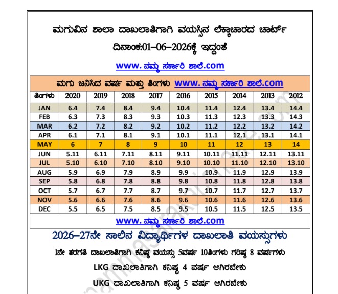 ದಾಖಲಾತಿಯ ಸಮಯದಲ್ಲಿ ಗೊಂದಲವನ್ನು ತಪ್ಪಿಸಲು, ಮಗು ಹುಟ್ಟಿದ ವರ್ಷ ಮತ್ತು ತಿಂಗಳಿಗನುಗುಣವಾಗಿ 01-06-2026ಕ್ಕೆ ಎಷ್ಟು ವಯಸ್ಸಾಗುತ್ತದೆ ಎಂಬುದನ್ನು ಈ ಕೆಳಗಿನ ಪಟ್ಟಿಯಲ್ಲಿ ನೋಡಬಹುದು: