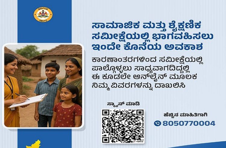 ಸೆಪ್ಟೆಂಬರ್ 22 ರಿಂದ ಆರಂಭಿಸಲಾದ ಸಾಮಾಜಿಕ ಮತ್ತು ಶೈಕ್ಷಣಿಕ ಸಮೀಕ್ಷೆಯು ಇಂದು ಮುಕ್ತಾಯಗೊಳ್ಳಲಿದೆ. ಹೀಗಾಗಿ ಆದಷ್ಟು ಬೇಗ ಜಾತಿಗಣತಿ ಸಮೀಕ್ಷೆಯಲ್ಲಿ ಪಾಲ್ಗೊಳ್ಳದವರು ಆನ್ ಲೈನ್ ಮೂಲಕ ದಾಖಲಿಸುವಂತೆ ಹಿಂದುಳಿದ ವರ್ಗಗಳ ಆಯೋಗವು ಮನವಿ ಮಾಡಿದೆ.