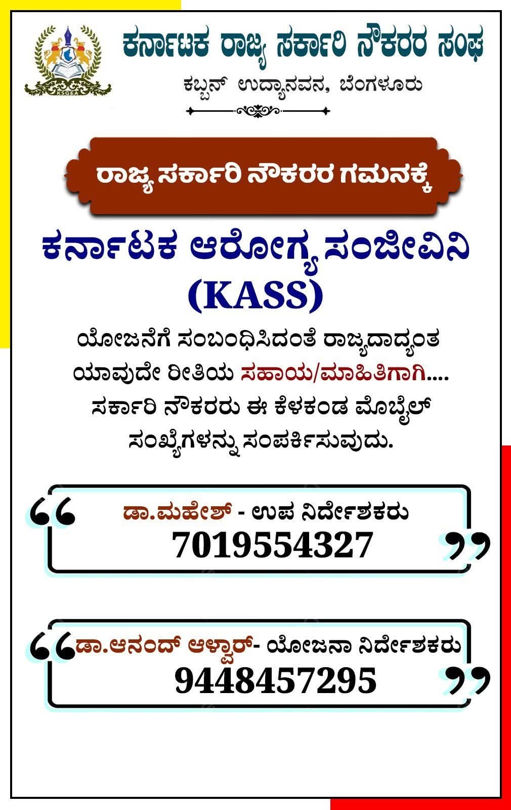 ಕರ್ನಾಟಕ ಆರೋಗ್ಯ ಸಂಜೀವಿನಿ (KASS) ಯೋಜನೆಗೆ ಸಂಬಂಧಿಸಿದಂತೆ ರಾಜ್ಯದಾದ್ಯಂತ ಯಾವುದೇ ರೀತಿಯ ಸಹಾಯ/ಮಾಹಿತಿಗಾಗಿ.. ಸರ್ಕಾರಿ ನೌಕರರು ಈ ಕೆಳಕಂಡ ಮೊಬೈಲ್ ಸಂಖ್ಯೆಗಳನ್ನು ಸಂಪರ್ಕಿಸುವುದು.