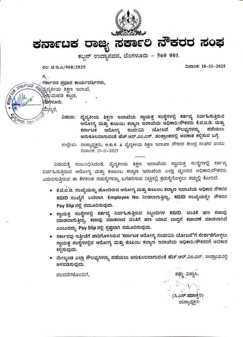 ಬೆಂಗಳೂರು :ವೈದ್ಯಕೀಯ ಶಿಕ್ಷಣ ಇಲಾಖೆಯ ಸ್ವಾಯತ್ತ ಸಂಸ್ಥೆಗಳಲ್ಲಿ ಕರ್ತವ್ಯ ನಿರ್ವಹಿಸುತ್ತಿರುವ ಆರೋಗ್ಯ ಮತ್ತು ಕುಟುಂಬ ಕಲ್ಯಾಣ ಇಲಾಖೆಯ ಅಧಿಕಾರಿ/ನೌಕರರು ಕೆ.ಜಿ.ಐ.ಡಿ. ಮತ್ತು ಕರ್ನಾಟಕ ಆರೋಗ್ಯ ಸಂಜೀವಿನಿ ಯೋಜನೆ ಸೌಲಭ್ಯಗಳನ್ನು ಪಡೆಯಲು ಅನುಕೂಲವಾಗುವಂತೆ ಹೆಚ್.ಆರ್.ಎಂ.ಎಸ್. ತಂತ್ರಾಂಶದಲ್ಲಿ ಅವಕಾಶ ಕಲ್ಪಿಸುವ ಬಗ್ಗೆ ಇಲ್ಲಿದೆ ಮಹತ್ವದ ಮಾಹಿತಿ.