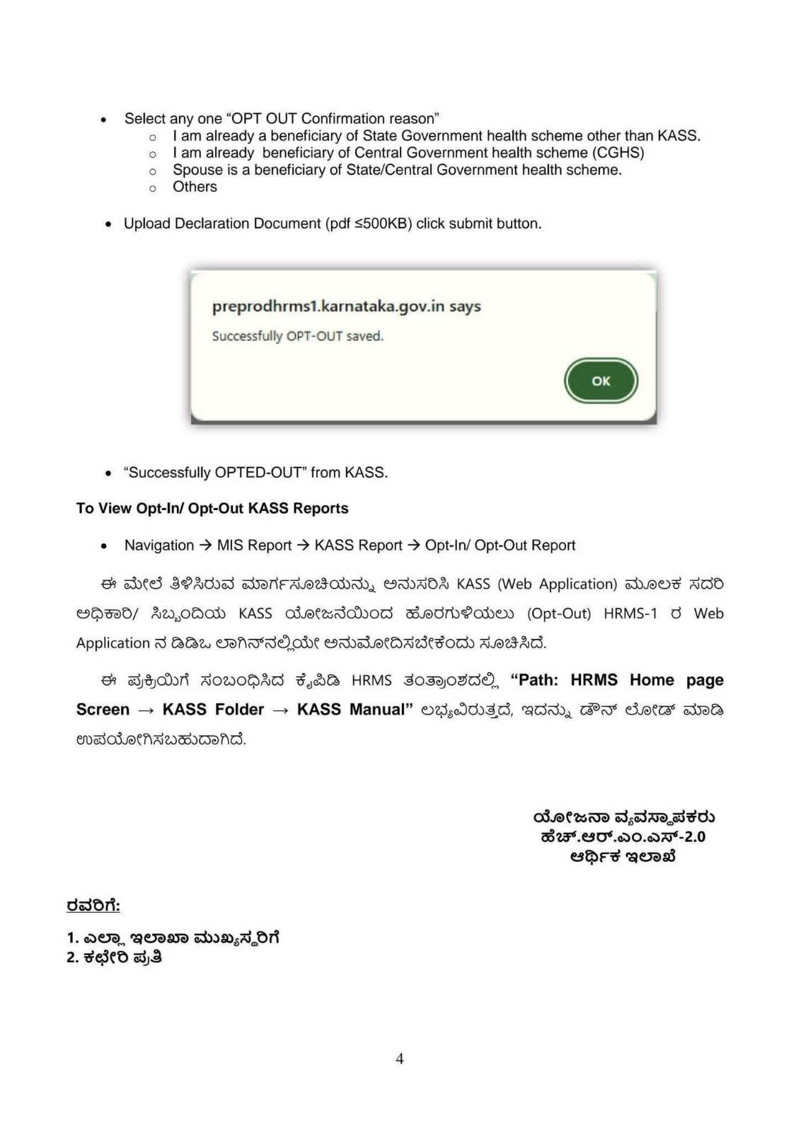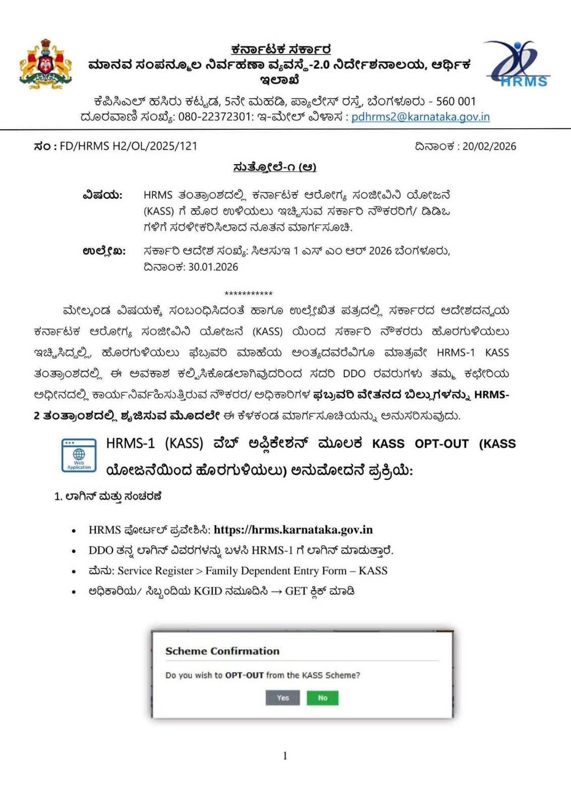 ಮೇಲ್ಕಂಡ ವಿಷಯಕ್ಕೆ ಸಂಬಂಧಿಸಿದಂತೆ ಹಾಗೂ ಉಲ್ಲೇಖಿತ ಪತ್ರದಲ್ಲಿ ಸರ್ಕಾರದ ಆದೇಶದನ್ವಯ ಕರ್ನಾಟಕ ಆರೋಗ್ಯ ಸಂಜೀವಿನಿ ಯೋಜನೆ (KASS) ಯಿಂದ ಸರ್ಕಾರಿ ನೌಕರರು ಹೊರಗುಳಿಯಲು ಇಚ್ಚಿಸಿದ್ದಲ್ಲಿ, ಹೊರಗುಳಿಯಲು ಫೆಬ್ರವರಿ ಮಾಹೆಯ ಅಂತ್ಯದವರೆವಿಗೂ ಮಾತ್ರವೇ HRMS-1 KASS ತಂತ್ರಾಂಶದಲ್ಲಿ ಈ ಅವಕಾಶ ಕಲ್ಪಿಸಿಕೊಡಲಾಗಿವುದರಿಂದ ಸದರಿ DDO ರವರುಗಳು ತಮ್ಮ ಕಛೇರಿಯ ಅಧೀನದಲ್ಲಿ ಕಾರ್ಯನಿರ್ವಹಿಸುತ್ತಿರುವ ನೌಕರರ/ ಅಧಿಕಾರಿಗಳ ಫಬ್ರವರಿ ವೇತನದ ಬಿಲ್ಲುಗಳನ್ನು HRMS-2 ತಂತ್ರಾಂಶದಲ್ಲಿ ಸೃಜಿಸುವ ಮೊದಲೇ ಈ ಕೆಳಕಂಡ ಮಾರ್ಗಸೂಚಿಯನ್ನು ಅನುಸರಿಸುವುದು.
