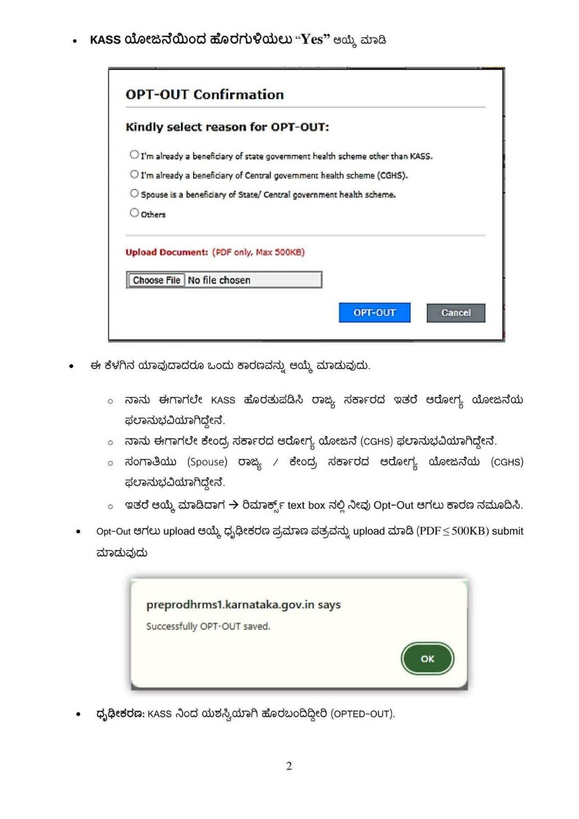 ಮೇಲ್ಕಂಡ ವಿಷಯಕ್ಕೆ ಸಂಬಂಧಿಸಿದಂತೆ ಹಾಗೂ ಉಲ್ಲೇಖಿತ ಪತ್ರದಲ್ಲಿ ಸರ್ಕಾರದ ಆದೇಶದನ್ವಯ ಕರ್ನಾಟಕ ಆರೋಗ್ಯ ಸಂಜೀವಿನಿ ಯೋಜನೆ (KASS) ಯಿಂದ ಸರ್ಕಾರಿ ನೌಕರರು ಹೊರಗುಳಿಯಲು ಇಚ್ಚಿಸಿದ್ದಲ್ಲಿ, ಹೊರಗುಳಿಯಲು ಫೆಬ್ರವರಿ ಮಾಹೆಯ ಅಂತ್ಯದವರೆವಿಗೂ ಮಾತ್ರವೇ HRMS-1 KASS ತಂತ್ರಾಂಶದಲ್ಲಿ ಈ ಅವಕಾಶ ಕಲ್ಪಿಸಿಕೊಡಲಾಗಿವುದರಿಂದ ಸದರಿ DDO ರವರುಗಳು ತಮ್ಮ ಕಛೇರಿಯ ಅಧೀನದಲ್ಲಿ ಕಾರ್ಯನಿರ್ವಹಿಸುತ್ತಿರುವ ನೌಕರರ/ ಅಧಿಕಾರಿಗಳ ಫಬ್ರವರಿ ವೇತನದ ಬಿಲ್ಲುಗಳನ್ನು HRMS-2 ತಂತ್ರಾಂಶದಲ್ಲಿ ಸೃಜಿಸುವ ಮೊದಲೇ ಈ ಕೆಳಕಂಡ ಮಾರ್ಗಸೂಚಿಯನ್ನು ಅನುಸರಿಸುವುದು.