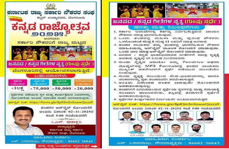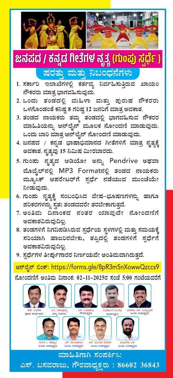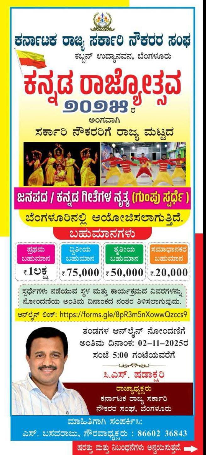 ಬೆಂಗಳೂರು : ಕನ್ನಡ ರಾಜ್ಯೋತ್ಸವ ಅಂಗವಾಗಿ ಸರ್ಕಾರಿ ನೌಕರರಿಗೆ ರಾಜ್ಯ ಮಟ್ಟದ ಜನಪದ / ಕನ್ನಡ ಗೀತೆಗಳ ನೃತ್ಯ (ಗುಂಪು ಸ್ಪರ್ಧೆ ) ಬೆಂಗಳೂರಿನಲ್ಲಿ ಆಯೋಜಿಸಲಾಗುತ್ತಿದೆ.