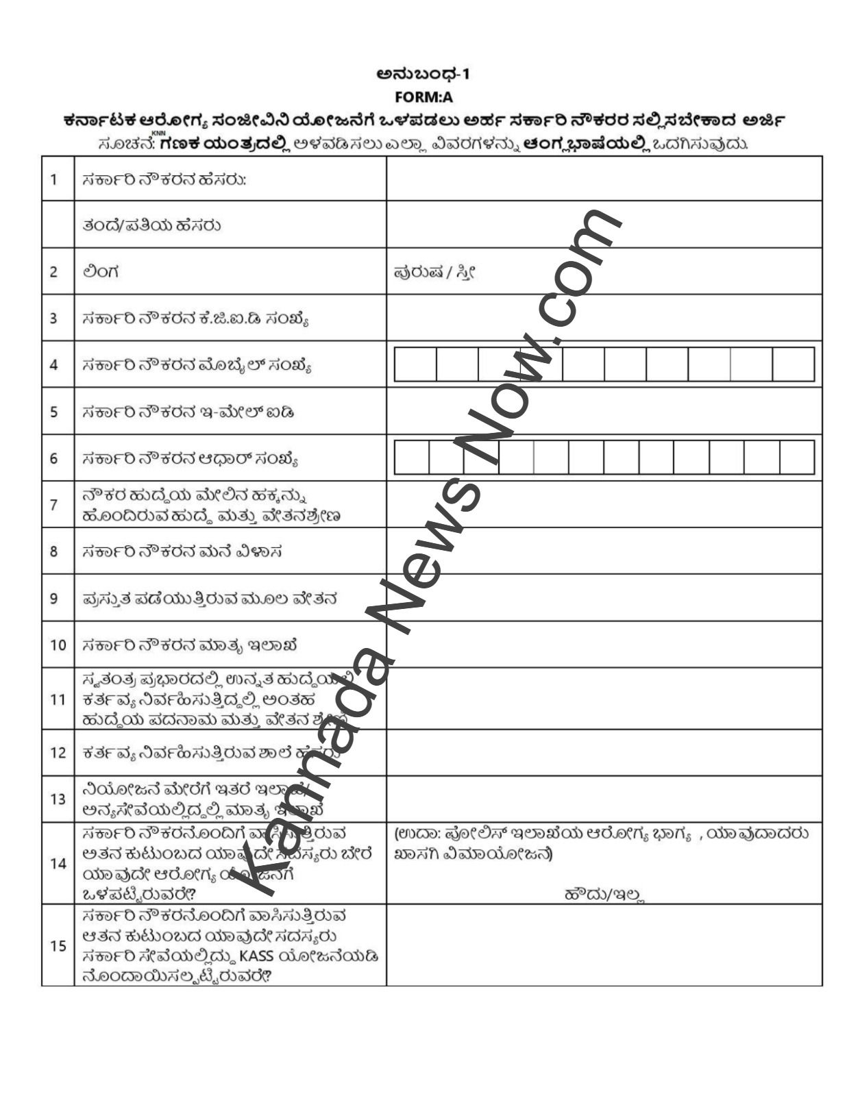 ಕರ್ನಾಟಕ ಆರೋಗ್ಯ ಸಂಜೀವಿನಿ ಯೋಜನೆಗೆ ಒಳಪಡಲು ಅರ್ಹ ಸರ್ಕಾರಿ ನೌಕರರು ಅರ್ಜಿ ಸಲ್ಲಿಸಲು ಈ ಕೆಳಕಂಡ ದಾಖಲೆಗಳನ್ನು ಸಲ್ಲಿಸಬೇಕಾಗಿದೆ.