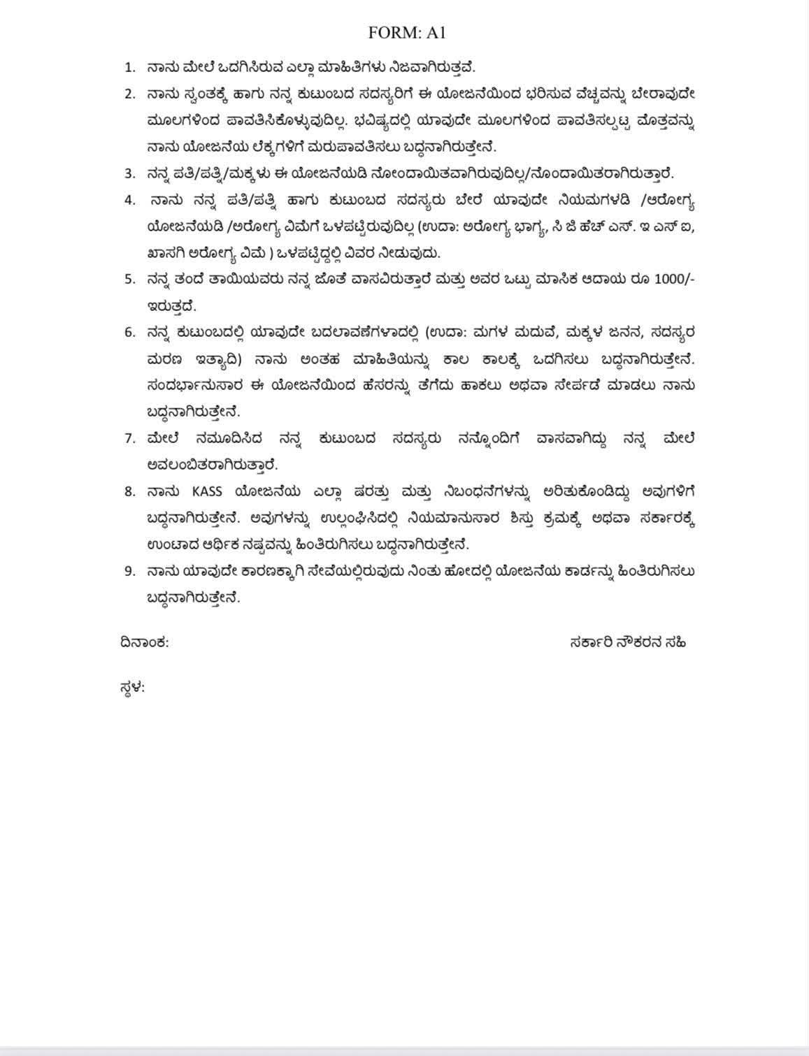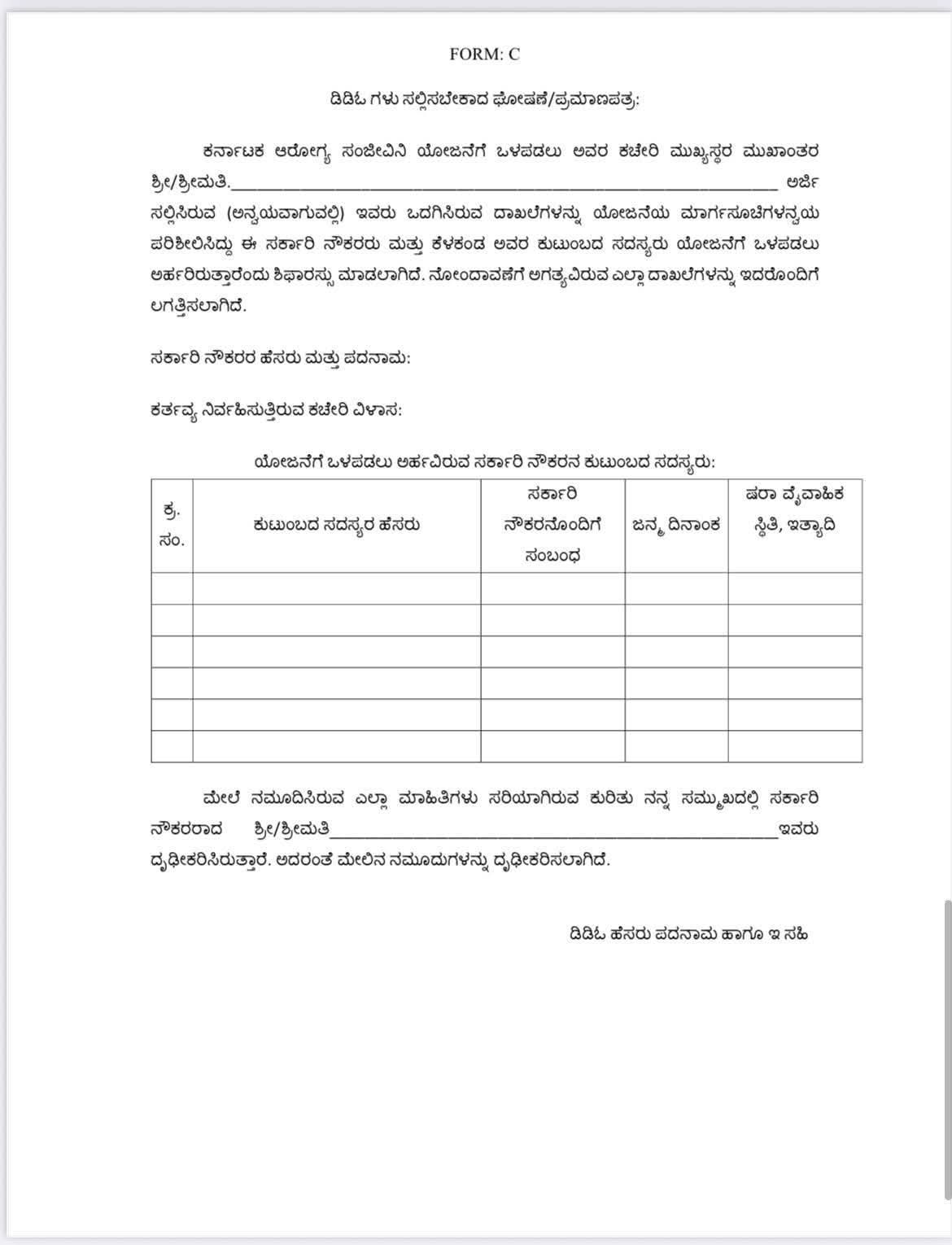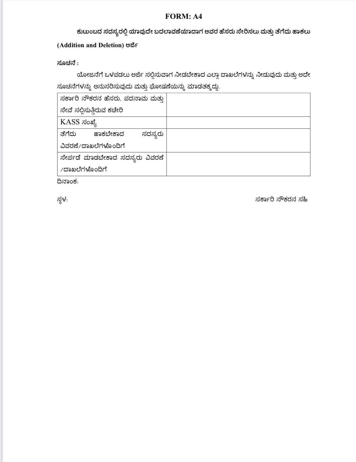 1. ಸರ್ಕಾರಿ ನೌಕರನ ಹಾಗು ಕುಟುಂಬದ ಅರ್ಹ ಸದಸ್ಯರ ಭಾವಚಿತ್ರಗಳು( ಪ್ರತಿಯೊಬ್ಬರ ಭಾವ ಚಿತ್ರವನ್ನು ಪ್ರತ್ಯೇಕವಾಗಿ ನೀಡತಕ್ಕದ್ದು, ಭಾವ ಚಿತ್ರದ ಮೇಲೆ ಸರ್ಕಾರಿ ನೌಕರ ತನ್ನ ಸಹಿ ಮತ್ತು ದಿನಾಂಕವನ್ನು ನಮೂದಿಸುವುದು ಮತ್ತು ಪ್ರತಿ ಐದು ವರ್ಷಗಳಿಗೆ ಒಮ್ಮೆ ಹೊಸ ಭಾವ ಚಿತ್ರವನ್ನು ಒದಗಿಸತಕ್ಕದ್ದು)
