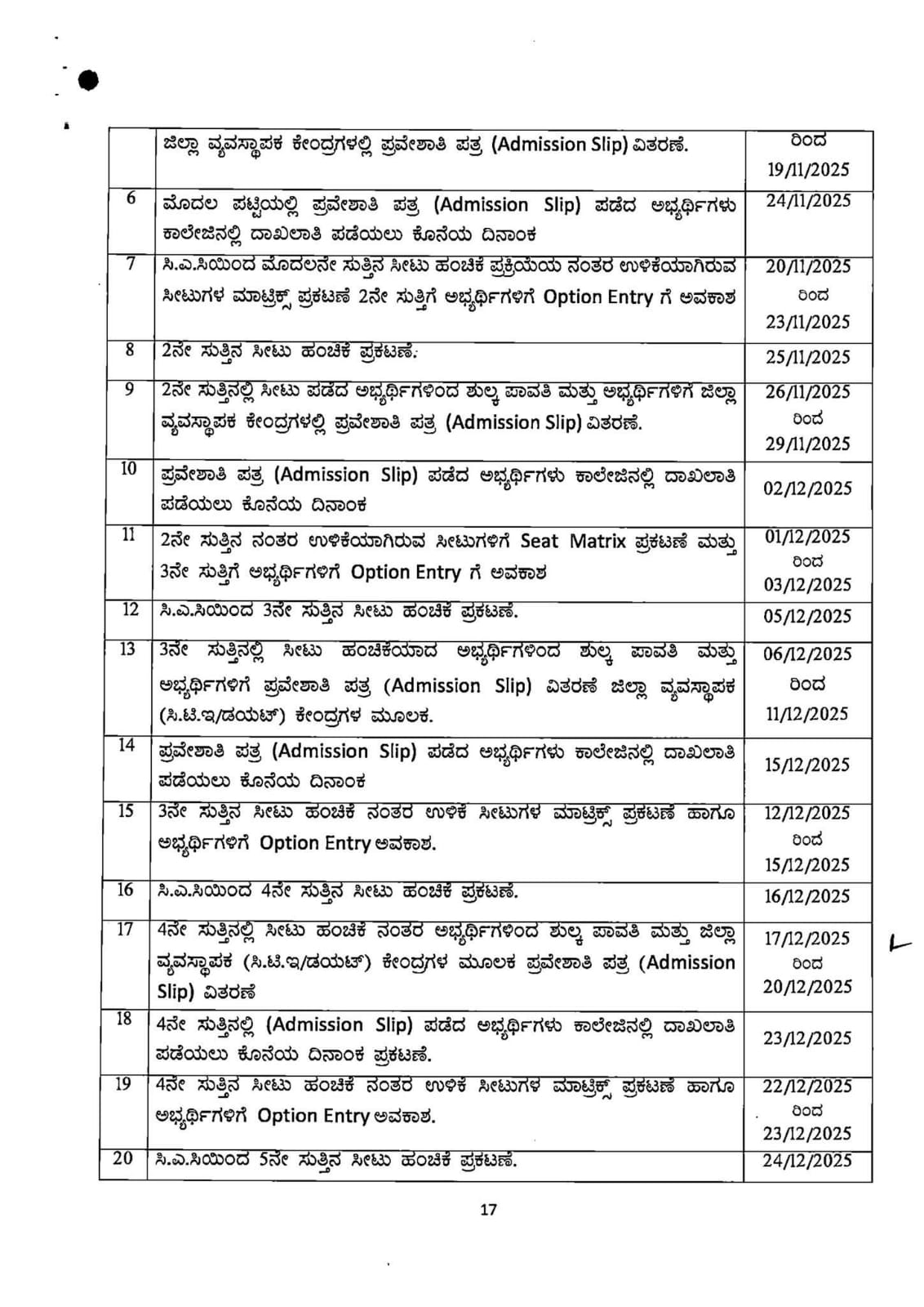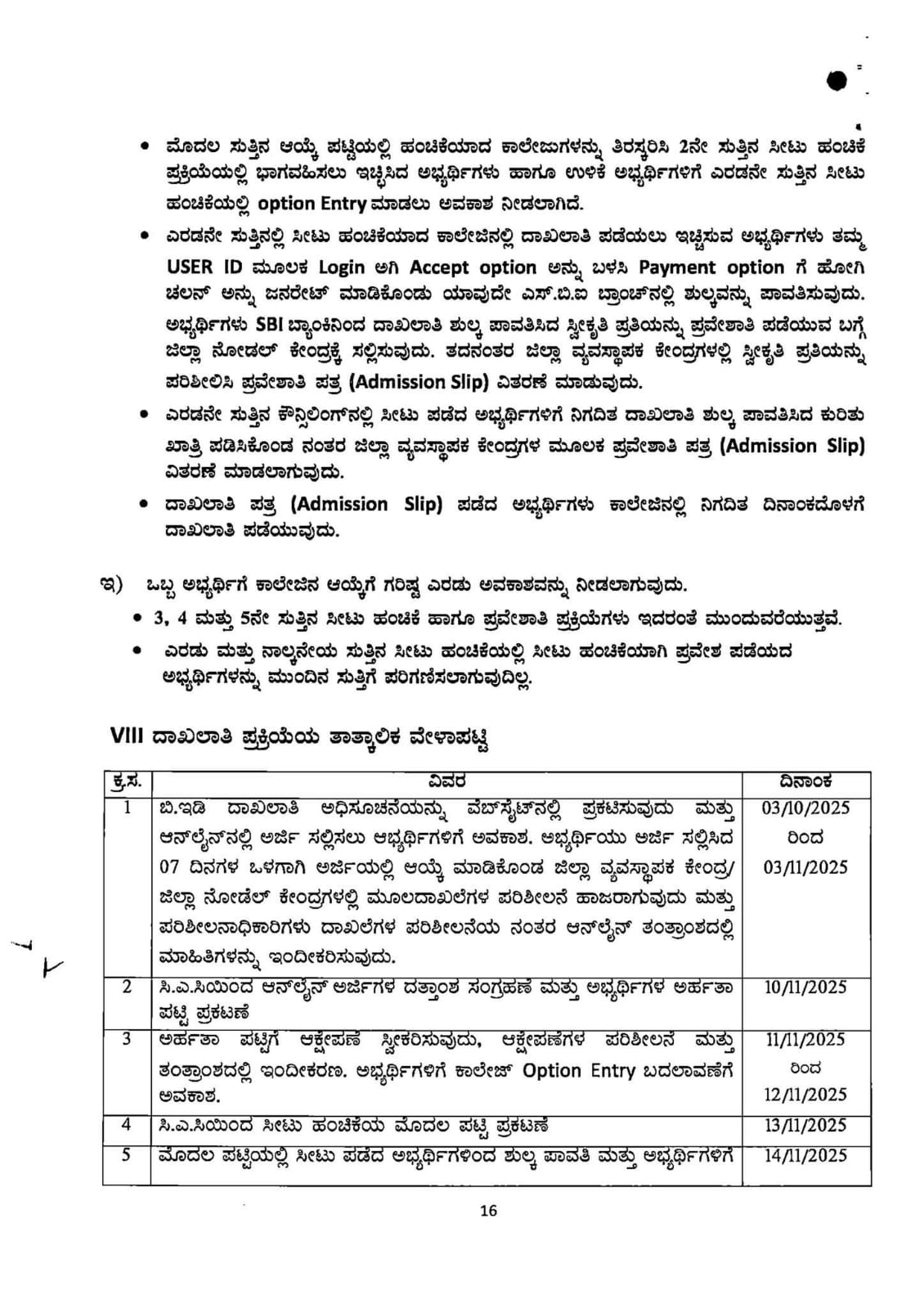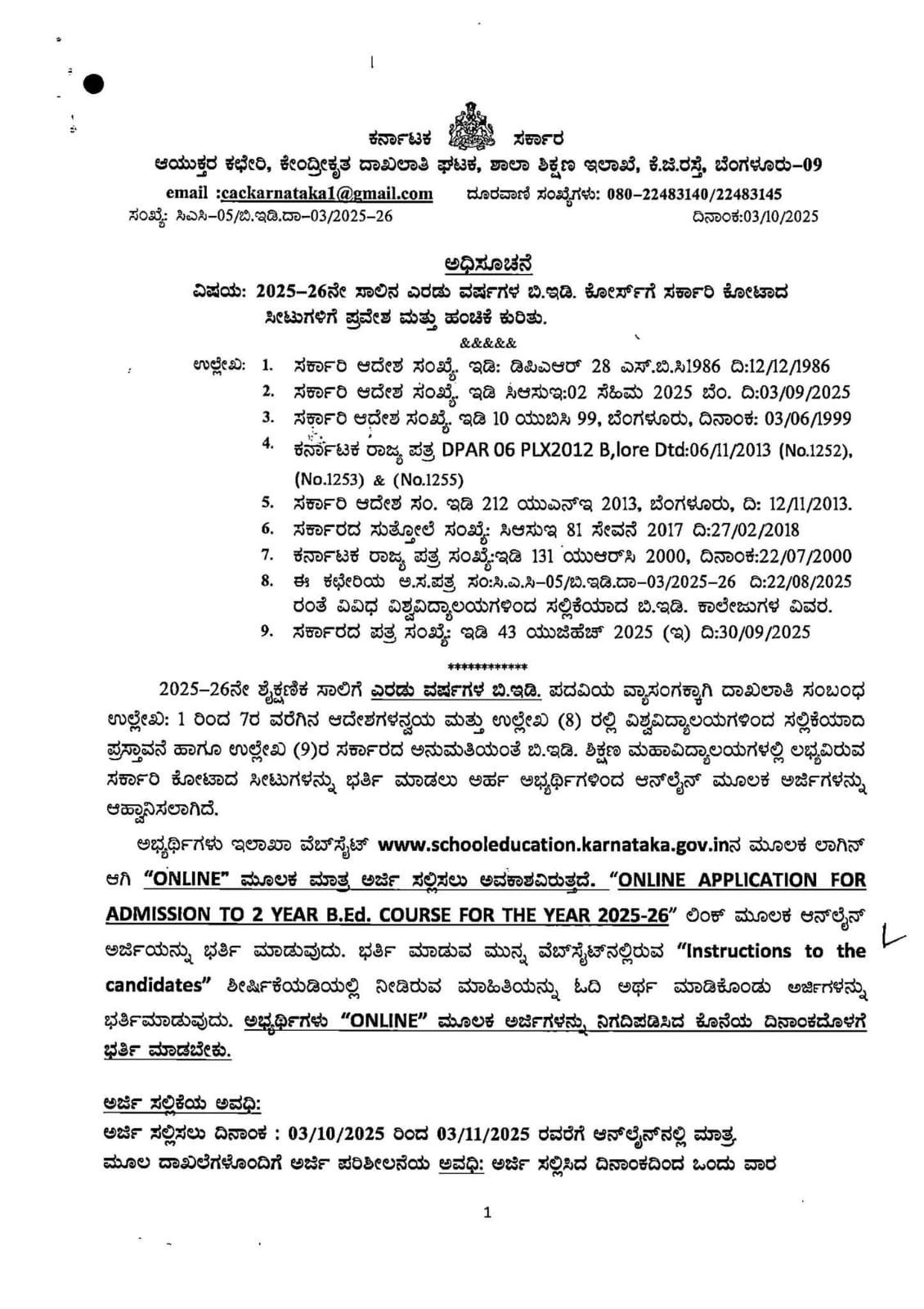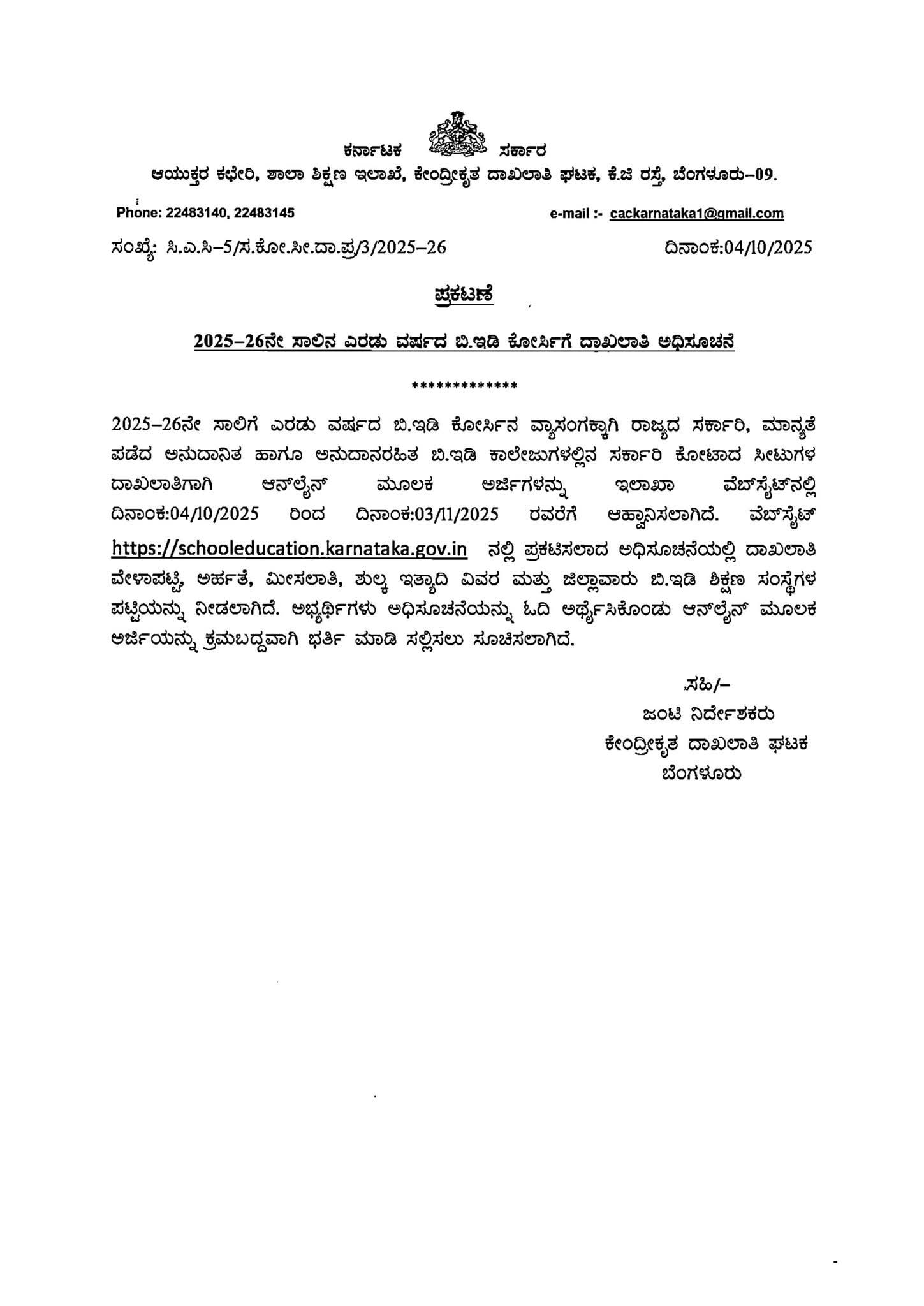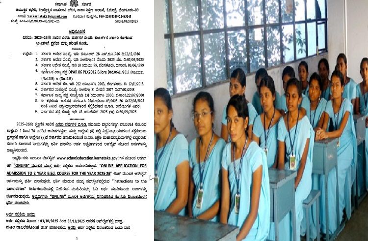 2025-26ನೇ ಸಾಲಿಗೆ ಎರಡು ವರ್ಷದ ಬಿ.ಇಡಿ ಕೋರ್ಸಿನ ವ್ಯಾಸಂಗಕ್ಕಾಗಿ ರಾಜ್ಯದ ಸರ್ಕಾರಿ, ಮಾನ್ಯತೆ ಪಡೆದ ಅನುದಾನಿತ ಹಾಗೂ ಅನುದಾನರಹಿತ ಬಿ.ಇಡಿ ಕಾಲೇಜುಗಳಲ್ಲಿನ ಸರ್ಕಾರಿ ಕೋಟಾದ ಸೀಟುಗಳ ದಾಖಲಾತಿಗಾಗಿ ಆನ್ಲೈನ್ ಮೂಲಕ ಅರ್ಜಿಗಳನ್ನು ಇಲಾಖಾ ವೆಬ್ಸೈಟ್ನಲ್ಲಿ ದಿನಾಂಖ :04/10/2025 ರಿಂದ 2:03/11/2025 ರವರೆಗೆ ಆಹ್ವಾನಿಸಲಾಗಿದೆ. ವೆಬ್ಸೈಟ್ https://schooleducation.karnataka.gov.in ವೇಳಾಪಟ್ಟಿ, ಅರ್ಹತೆ, ಮೀಸಲಾತಿ, ಶುಲ್ಕ ಇತ್ಯಾದಿ ವಿವರ ಮತ್ತು ಜಿಲ್ಲಾವಾರು ಬಿ.ಇಡಿ ಶಿಕ್ಷಣ ಸಂಸ್ಥೆಗಳ ಪಟ್ಟಿಯನ್ನು ನೀಡಲಾಗಿದೆ. ಅಭ್ಯರ್ಥಿಗಳು ಅಧಿಸೂಚನೆಯನ್ನು ಓದಿ ಅರ್ಥೈಸಿಕೊಂಡು ಆನ್ಲೈನ್ ಮೂಲಕ ಅರ್ಜಿಯನ್ನು ಕ್ರಮಬದ್ದವಾಗಿ ಭರ್ತಿ ಮಾಡಿ ಸಲ್ಲಿಸಲು ಸೂಚಿಸಲಾಗಿದೆ.
