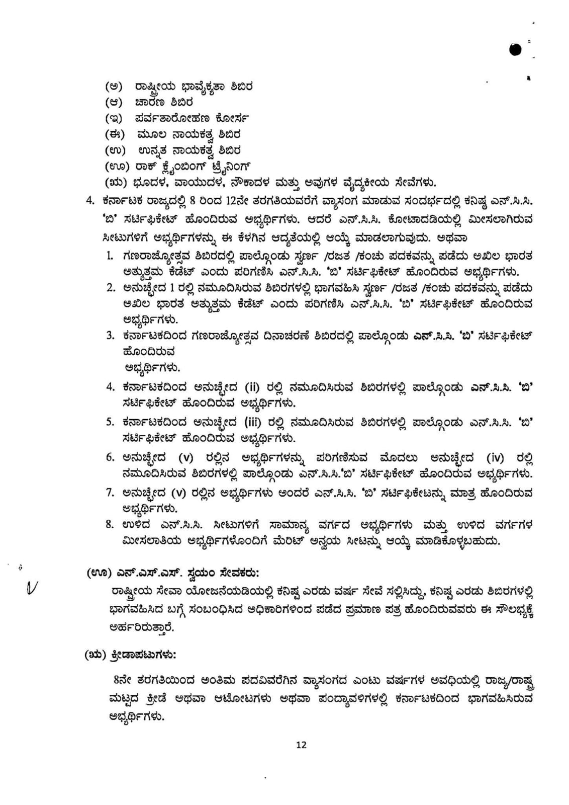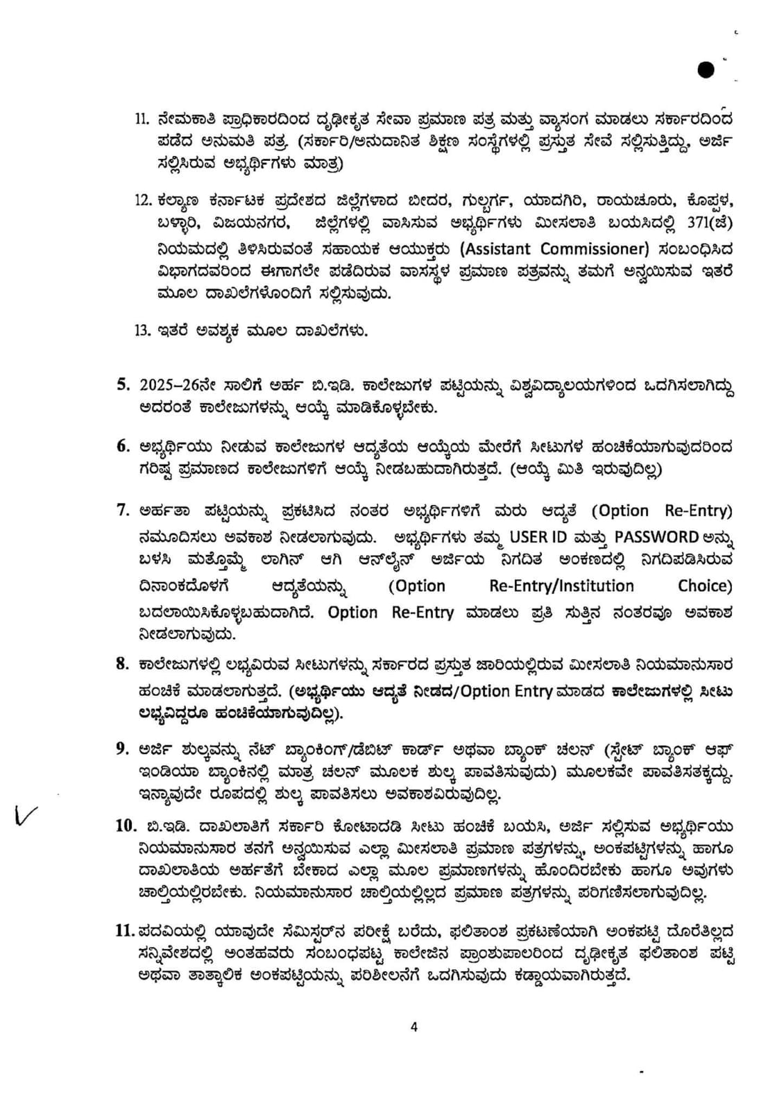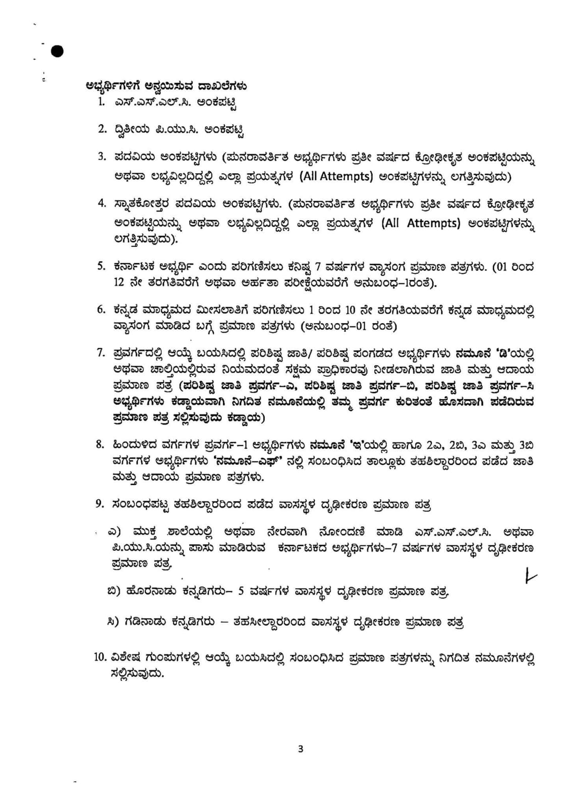 4. ಅಭ್ಯರ್ಥಿಗಳು ಕೆಳಕಂಡಂತೆ ಅಭ್ಯರ್ಥಿಗಳಿಗೆ ಅನ್ವಯಿಸುವ ಮೂಲ ದಾಖಲೆಗಳನ್ವಯ ಅರ್ಜಿ ನಮೂನೆಯಲ್ಲಿ ನೀಡಿರುವ ಅಂಕಣಗಳಲ್ಲಿ ಭರ್ತಿ ಮಾಡಬೇಕು ಸಂಬಂಧಿಸಿದ ಪ್ರಮಾಣಪತ್ರದ ಪ್ರತಿಯನ್ನು ತಪ್ಪದೇ ಅಪ್ಲೋಡ್ ಮಾಡಬೇಕು.