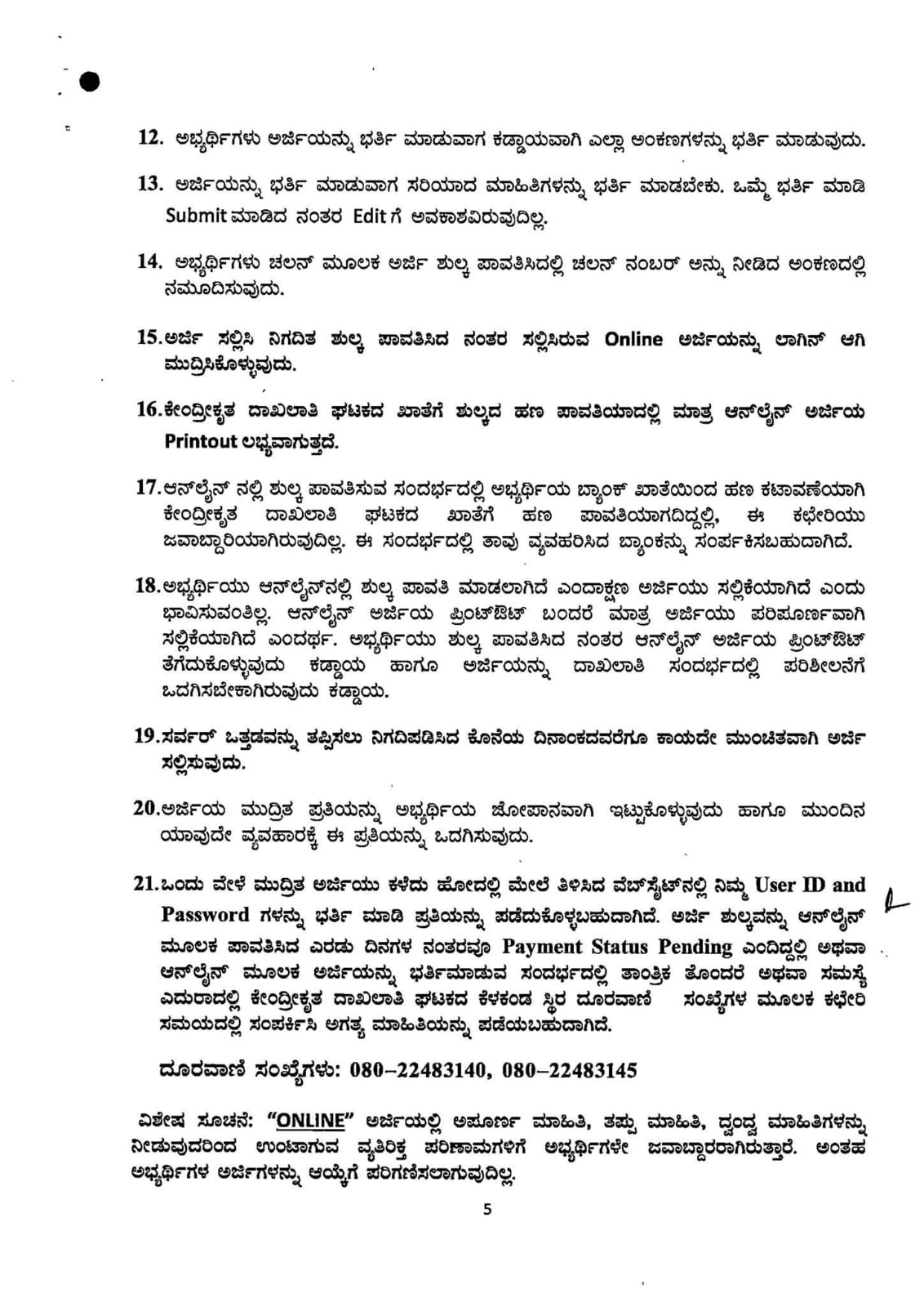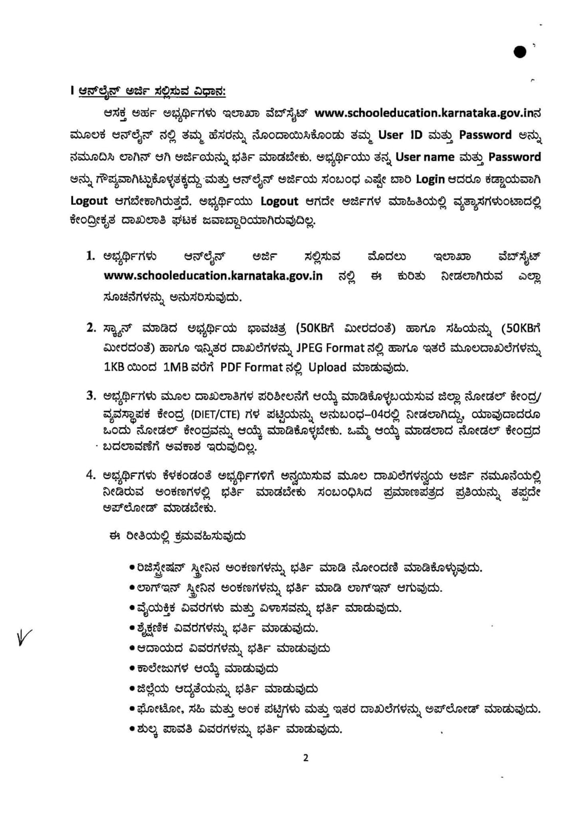1. ಅಭ್ಯರ್ಥಿಗಳು ಆನ್ಲೈನ್ ಅರ್ಜಿ ಸಲ್ಲಿಸುವ ಮೊದಲು www.schooleducation.karnataka.gov.in ಸೂಚನೆಗಳನ್ನು ಅನುಸರಿಸುವುದು.
