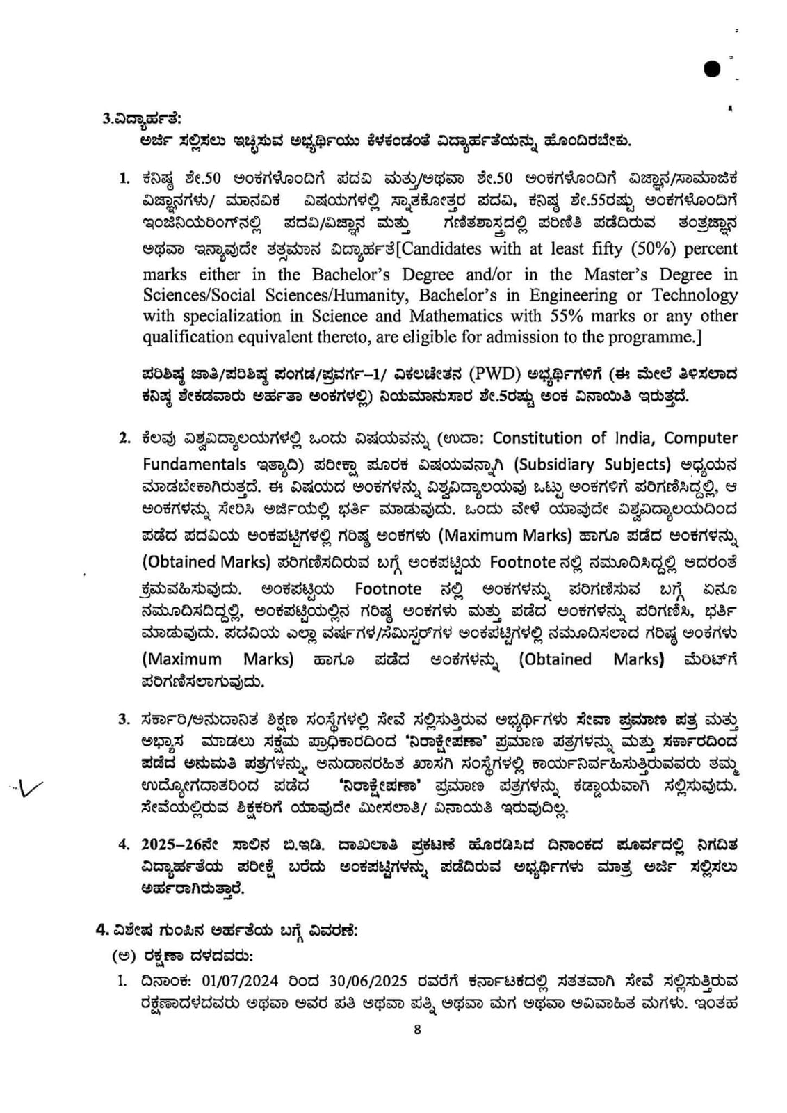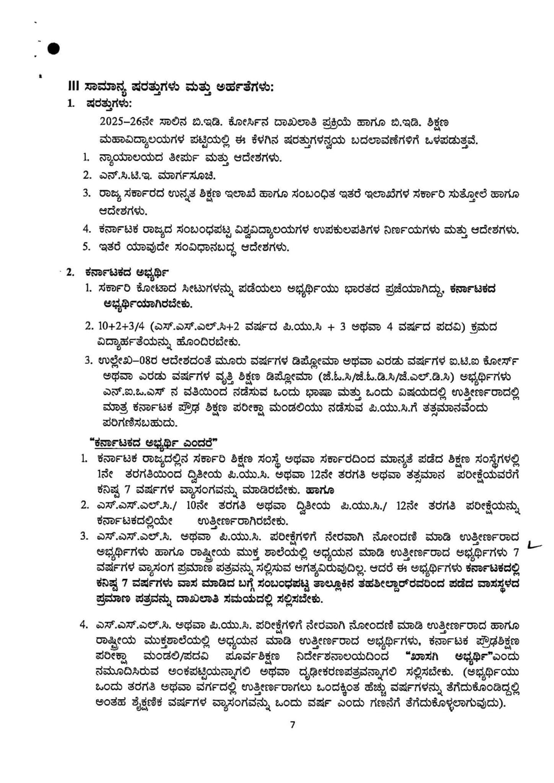 2025-26ನೇ ಶೈಕ್ಷಣಿಕ ಸಾಲಿಗೆ ಎರಡು ವರ್ಷಗಳ ಬಿ.ಇಡಿ. ಪದವಿಯ ವ್ಯಾಸಂಗಕ್ಕಾಗಿ ದಾಖಲಾತಿ ಸಂಬಂಧ ಉಲ್ಲೇಖ: 1 ರಿಂದ 7ರ ವರೆಗಿನ ಆದೇಶಗಳನ್ವಯ ಮತ್ತು ಉಲ್ಲೇಖ (8) ರಲ್ಲಿ ವಿಶ್ವವಿದ್ಯಾಲಯಗಳಿಂದ ಸಲ್ಲಿಕೆಯಾದ ಪ್ರಸ್ತಾವನೆ ಹಾಗೂ ಉಲ್ಲೇಖ (9)ರ ಸರ್ಕಾರದ ಅನುಮತಿಯಂತೆ ಬಿ.ಇಡಿ. ಶಿಕ್ಷಣ ಮಹಾವಿದ್ಯಾಲಯಗಳಲ್ಲಿ ಲಭ್ಯವಿರುವ ಸರ್ಕಾರಿ ಕೋಟಾದ ಸೀಟುಗಳನ್ನು ಭರ್ತಿ ಮಾಡಲು ಅರ್ಹ ಅಭ್ಯರ್ಥಿಗಳಿಂದ ಆನ್ಲೈನ್ ಮೂಲಕ ಅರ್ಜಿಗಳನ್ನು ಆಹ್ವಾನಿಸಲಾಗಿದೆ.