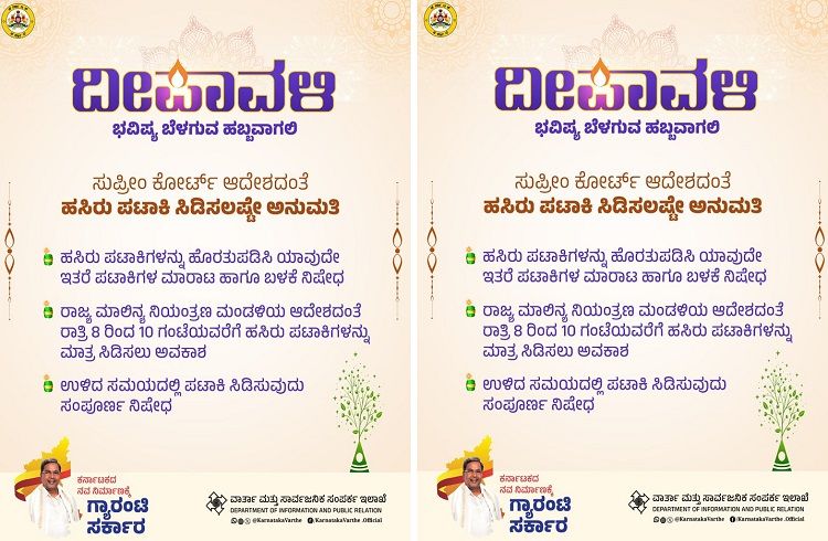 ರಾಜ್ಯ ಮಾಲಿನ್ಯ ನಿಯಂತ್ರಣ ಮಂಡಳಿಯ ಆದೇಶದಂತೆ ರಾತ್ರಿ 8 ರಿಂದ 10 ಗಂಟೆಯವರೆಗೆ ಹಸಿರು ಪಟಾಕಿಗಳನ್ನು ಮಾತ್ರ ಸಿಡಿಸಲು ಅವಕಾಶ