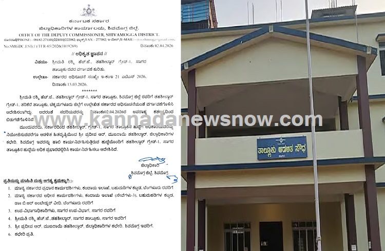 ಶಿವಮೊಗ್ಗ: ಶಿವಮೊಗ್ಗ ಜಿಲ್ಲೆಯ ಸಾಗರ ತಾಲ್ಲೂಕಿನ ತಹಶೀಲ್ದಾರ್ ಗ್ರೇಡ್-1 ಅಧಿಕಾರಿಯಾಗಿದ್ದ ರಶ್ಮಿ ಹೆಚ್.ಜೆ. ಅವರನ್ನು ವರ್ಗಾವಣೆಗೊಳಿಸಿ ಆದೇಶ ಹೊರಡಿಸಲಾಗಿದೆ. ಶಿವಮೊಗ್ಗ ಜಿಲ್ಲಾಧಿಕಾರಿಗಳ ಕಾರ್ಯಾಲಯದಿಂದ ಈ ಕುರಿತು ಅಧಿಕೃತ ಜ್ಞಾಪನ ಹೊರಬಿದ್ದಿದೆ. ವರ್ಗಾವಣೆ ವಿವರ: ಅಧಿಕಾರಿ: ರಶ್ಮಿ ಹೆಚ್.ಜೆ., ತಹಶೀಲ್ದಾರ್ ಗ್ರೇಡ್-1, ಸಾಗರ ತಾಲ್ಲೂಕು. ಸ್ಥಳಾಂತರ: ಇವರನ್ನು ಚಿಕ್ಕಮಗಳೂರು ಜಿಲ್ಲೆಯ ತರಿಕೆರೆ ತಾಲ್ಲೂಕಿನ ತಹಶೀಲ್ದಾರ್ ಗ್ರೇಡ್-1 ಹುದ್ದೆಗೆ ವರ್ಗಾವಣೆ ಮಾಡಲಾಗಿದೆ. ಬಿಡುಗಡೆ: ಸರ್ಕಾರದ ಅಧಿಸೂಚನೆಯನ್ವಯ (ಸಂಖ್ಯೆ: ಇ-ಕಂಇ 21 ಎಟಿಎಸ್ 2026), ಇವರನ್ನು ದಿನಾಂಕ: 02.04.2026ರ ಅಪರಾಹ್ನದಿಂದ ಕರ್ತವ್ಯದಿಂದ ಬಿಡುಗಡೆಗೊಳಿಸಲಾಗಿದೆ. ತಾತ್ಕಾಲಿಕ ಉಸ್ತುವಾರಿ: ಸಾಗರ ತಹಶೀಲ್ದಾರ್ ಹುದ್ದೆಗೆ ಸರ್ಕಾರದಿಂದ ಹೊಸ ಅಧಿಕಾರಿಯನ್ನು ನಿಯೋಜಿಸುವವರೆಗೂ ಆಡಳಿತಾತ್ಮಕ ಹಿತದೃಷ್ಟಿಯಿಂದ ಪರ್ಯಾಯ ವ್ಯವಸ್ಥೆ ಮಾಡಲಾಗಿದೆ. ಶಿವಮೊಗ್ಗ ಜಿಲ್ಲಾಧಿಕಾರಿಗಳ ಕಛೇರಿಯ ಮುಜರಾಯಿ ತಹಶೀಲ್ದಾರ್ ಆಗಿರುವ ಪ್ರದೀಪ ಆರ್. ಅವರಿಗೆ ಸಾಗರ ತಾಲ್ಲೂಕಿನ ತಹಶೀಲ್ದಾರ್ ಗ್ರೇಡ್-1 ಹುದ್ದೆಯ ಅಧಿಕ ಪ್ರಭಾರವನ್ನು (Additional Charge) ವಹಿಸಿ ಆದೇಶಿಸಲಾಗಿದೆ. ಇವರು ತಮ್ಮ ಹಾಲಿ ಹುದ್ದೆಯೊಂದಿಗೆ ಸಾಗರ ತಾಲ್ಲೂಕಿನ ಜವಾಬ್ದಾರಿಯನ್ನು ನಿರ್ವಹಿಸಲಿದ್ದಾರೆ. ಈ ಆದೇಶದ…