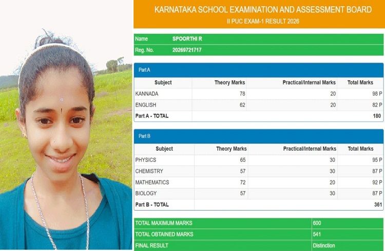 ಶಿವಮೊಗ್ಗ: ಇಂದು ಪ್ರಕಟವಾದ 2026ರ ದ್ವಿತೀಯ ಪಿಯುಸಿ ಪರೀಕ್ಷೆ-1ರ ಫಲಿತಾಂಶದಲ್ಲಿ ಶಿವಮೊಗ್ಗ ಜಿಲ್ಲೆಯ ಸೊರಬ ತಾಲ್ಲೂಕಿನ ಉಳವಿಯ ವಿದ್ಯಾರ್ಥಿ ಶಂಕರ್ ಎಸ್ ಬಿ ಅತ್ಯುತ್ತಮ ಅಂಕಗಳನ್ನು ಪಡೆಯುವ ಮೂಲಕ ಶಾಲೆಗೆ, ಪೋಷಕರಿಗೆ ಹೆಮ್ಮೆ ತಂದಿದ್ದಾರೆ. ಅಂಕಗಳ ವಿವರ: ಶೇ. 90.33 ರಷ್ಟು ಫಲಿತಾಂಶ! ಶಿವಮೊಗ್ಗದ ಶ್ರೀ ಆದಿಚುಂಚನಗಿರಿ ಪಿಯು ಕಾಲೇಜಿನ ವಿದ್ಯಾರ್ಥಿಯಾದ ಶಂಕರ್ ಎಸ್ ಬಿ ಅವರು ಒಟ್ಟು 600 ಅಂಕಗಳಿಗೆ 542 ಅಂಕಗಳನ್ನು (Distinction) ಪಡೆಯುವ ಮೂಲಕ ಅಮೋಘ ಸಾಧನೆ ಮಾಡಿದ್ದಾರೆ. ವಿಷಯವಾರು ಗಳಿಸಿದ ಅಂಕಗಳು: ಕನ್ನಡ: 88 ಇಂಗ್ಲೀಷ್: 83 ಭೌತಶಾಸ್ತ್ರ (Physics): 87 ರಸಾಯನಶಾಸ್ತ್ರ (Chemistry): 96 ಗಣಿತ (Mathematics): 98 ಜೀವಶಾಸ್ತ್ರ (Biology): 90 ವಿಶೇಷವಾಗಿ ಗಣಿತ ಮತ್ತು ರಸಾಯನಶಾಸ್ತ್ರ ವಿಷಯಗಳಲ್ಲಿ ಶಂಕರ್ ಸಾಧನೆ ಮೆಚ್ಚುವಂತಿದೆ. ಕುಟುಂಬದಲ್ಲಿ ಮನೆ ಮಾಡಿದ ಸಂಭ್ರಮ: ಶಂಕರ್ ಅವರು ಸೊರಬ ತಾಲ್ಲೂಕಿನ ಉಳವಿಯಲ್ಲಿ ‘ಶ್ರೀ ಗುರುಕೃಪಾ ಮೆಡಿಕಲ್ಸ್’ ನಡೆಸುತ್ತಿರುವ ಪ್ರಕಾಶ್ ಹಾಗೂ ಸಂಗೀತ ದಂಪತಿಗಳ ಪ್ರಥಮ ಪುತ್ರ. ಮೂಲತಃ ದಾವಣಗೆರೆ…