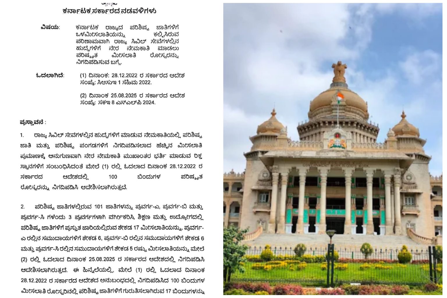 ಬೆಂಗಳೂರು: ಕರ್ನಾಟಕ ರಾಜ್ಯದ ಪರಿಶಿಷ್ಟ ಜಾತಿಗಳಿಗೆ ಒಳಮೀಸಲಾತಿಯನ್ನು ಕಲ್ಪಿಸಿರುವಪ ರಿಣಾಮವಾಗಿ ರಾಜ್ಯ ಸಿವಿಲ್ ಸೇವೆಗಳಲ್ಲಿನ ಹುದ್ದೆಗಳಿಗೆ ಪರಿಷ್ಕೃತ ನೇಮಕಾತಿ ಮಾಡಲು ಮೀಸಲಾತಿ ರೋಸ್ಮರನ್ನು ಸರ್ಕಾರ ಪ್ರಕಟಿಸಿದೆ. ಇಂದು ರಾಜ್ಯ ಸರ್ಕಾರ ನಡವಳಿಕೆಯನ್ನು ಹೊರಡಿಸಿದ್ದು, ರಾಜ್ಯ ಸಿವಿಲ್ ಸೇವೆಗಳಲ್ಲಿನ ಹುದ್ದೆಗಳಿಗೆ ಮಾಡುವ ನೇಮಕಾತಿಯಲ್ಲಿ ಪರಿಶಿಷ್ಟ ಜಾತಿ ಮತ್ತು ಪರಿಶಿಷ್ಟ ಪಂಗಡಗಳಿಗೆ ನಿಗದಿಪಡಿಸಲಾದ ಹೆಚ್ಚಿನ ಮೀಸಲಾತಿ ಪ್ರಮಾಣಕ್ಕೆ ಅನುಗುಣವಾಗಿ ನೇರ ನೇಮಕಾತಿ ಮುಖಾಂತರ ಭರ್ತಿ ಮಾಡುವ ರಿಕ್ತ ಸ್ನಾನಗಳಿಗೆ ಸಂಬಂಧಿಸಿದಂತೆ ಮೇಲೆ (1) ರಲ್ಲಿ ಓದಲಾದ ದಿನಾಂಕ 28.12.2022 ರ ಸರ್ಕಾರದ ಆದೇಶದಲ್ಲಿ 100 ಬಿಂದುಗಳ ಪರಿಷ್ಕೃತ ರೋಸ್ಮರನ್ನು ನಿಗದಿಪಡಿಸಿ ಆದೇಶಿಸಲಾಗಿರುತ್ತದೆ ಎಂದಿದೆ. ಪರಿಶಿಷ್ಟ ಜಾತಿಗಳಲ್ಲಿರುವ 101 ಜಾತಿಗಳನ್ನು ಪ್ರವರ್ಗ-ಎ, ಪ್ರವರ್ಗ-ಬಿ ಮತ್ತು ಪ್ರವರ್ಗ-ಸಿ ಗಳೆಂದು 3 ಪ್ರವರ್ಗಗಳಾಗಿ ವರ್ಗೀಕರಿಸಿ, ಶಿಕ್ಷಣ ಮತ್ತು ಉದ್ಯೋಗದಲ್ಲಿ ಪರಿಶಿಷ್ಟ ಜಾತಿಗಳಿಗೆ ಪ್ರಸ್ತುತ ಜಾರಿಯಲ್ಲಿರುವ ಶೇಕಡ 17 ಮೀಸಲಾತಿಯನ್ನು, ಪ್ರವರ್ಗ- ಎ ರಲ್ಲಿನ ಸಮುದಾಯಗಳಿಗೆ ಶೇಕಡ 6, ಪ್ರವರ್ಗ-ಬಿ ರಲ್ಲಿನ ಸಮುದಾಯಗಳಿಗೆ ಶೇಕಡ 6 ಮತ್ತು ಪವರ್ಗ-ಸಿ ರಲ್ಲಿನ…