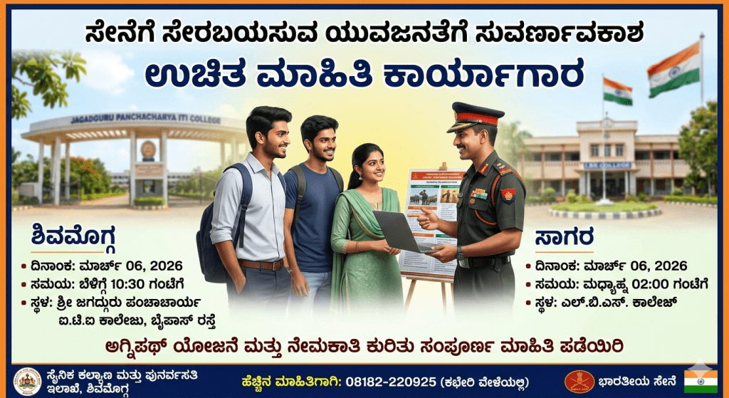ಶಿವಮೊಗ್ಗ: ದೇಶಸೇವೆಯ ಕನಸು ಹೊತ್ತಿರುವ ಶಿವಮೊಗ್ಗ ಜಿಲ್ಲೆಯ ಯುವಕ-ಯುವತಿಯರಿಗಾಗಿ ಅಗ್ನಿಪಥ್ ಯೋಜನೆಯಡಿ ಸೇನೆಗೆ ಸೇರುವ ಕುರಿತು ಸಮಗ್ರ ಮಾಹಿತಿ ನೀಡುವ ವಿಶೇಷ ಕಾರ್ಯಾಗಾರವನ್ನು ಹಮ್ಮಿಕೊಳ್ಳಲಾಗಿದೆ. ಮಂಗಳೂರಿನ ಸೇನಾ ನೇಮಕಾತಿ ಕಚೇರಿಯ ಅಧಿಕಾರಿಗಳ ಮಾರ್ಗದರ್ಶನದಲ್ಲಿ ಈ ಕಾರ್ಯಕ್ರಮ ನಡೆಯಲಿದ್ದು, ಸೇನೆಯಲ್ಲಿರುವ ಸವಲತ್ತುಗಳು ಮತ್ತು ನೇಮಕಾತಿ ಪ್ರಕ್ರಿಯೆಯ ಬಗ್ಗೆ ಸಂಪೂರ್ಣ ಮಾಹಿತಿ ನೀಡಲಾಗುತ್ತದೆ. ಕಾರ್ಯಕ್ರಮದ ವಿವರಗಳು: ಎಲ್ಲಿ ತರಬೇತಿ ಕಾರ್ಯಾಗಾರ ಆಯೋಜನೆ? * ಮಾರ್ಚ್ 06 | ಬೆಳಿಗ್ಗೆ 10:30 | ಶ್ರೀ ಜಗದ್ಗುರು ಪಂಚಾಚಾರ್ಯ ಐ.ಟಿ.ಐ ಕಾಲೇಜು, ಬೈಪಾಸ್ ರಸ್ತೆ, ಶಿವಮೊಗ್ಗ | ಮಾಜಿ ಸೈನಿಕರ ಸಂಘ * ಮಾರ್ಚ್ 06 | ಮಧ್ಯಾಹ್ನ 02:00 | ಎಲ್.ಬಿ.ಎಸ್. ಕಾಲೇಜ್, ಸಾಗರ | ಮಾಜಿ ಸೈನಿಕರ ಕಲ್ಯಾಣ ಟ್ರಸ್ಟ್ * ಅಗ್ನಿಪಥ್ ಯೋಜನೆ: ಸೇನೆಗೆ ಸೇರಲು ಇರುವ ಅರ್ಹತೆ ಮತ್ತು ಅವಕಾಶಗಳ ಕುರಿತು ತಜ್ಞರಿಂದ ಉಪನ್ಯಾಸ. * ನೇಮಕಾತಿ ಪ್ರಕ್ರಿಯೆ: ಶೀಘ್ರದಲ್ಲಿಯೇ ಆರಂಭವಾಗಲಿರುವ ಹೊಸ ನೇಮಕಾತಿ ಪ್ರಕ್ರಿಯೆಯ ಕುರಿತು ವಿವರಣೆ. * ಉಚಿತ…