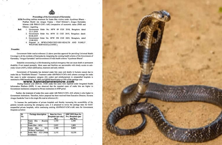 ಬೆಂಗಳೂರು: ರಾಜ್ಯದಲ್ಲಿ ಹಾವು ಕಡಿತಕ್ಕೆ ಒಳಗಾದಂತವರಿಗೆ ಆಯುಷ್ಮಾನ್ ಆರೋಗ್ಯ ಯೋಜನೆಯ ಅಡಿಯಲ್ಲಿ ಸರ್ಕಾರಿ ಆಸ್ಪತ್ರೆಗಳಲ್ಲಿ ಉಚಿತ ಚಿಕಿತ್ಸೆ ನೀಡಲಾಗುತ್ತಿದೆ. ಸರ್ಕಾರಿ ಆಸ್ಪತ್ರೆ ಹೊರತಾಗಿ ಖಾಸಗಿ ಆಸ್ಪತ್ರೆಯಲ್ಲಿ ಚಿಕಿತ್ಸೆ ಪಡೆಯುವಂತ ಕಡಿತಕ್ಕೆ ಒಳಗಾದವರಿಗೆ ಆಯುಷ್ಮಾನ್ ಆರೋಗ್ಯ ಯೋಜನೆಯ ಅಡಿಯಲ್ಲಿ ಚಿಕಿತ್ಸೆ ನೀಡಲು ಸರ್ಕಾರವು ದರ ನಿಗದಿ ಪಡಿಸಿ ಅಧಿಕೃತ ಆದೇಶ ಮಾಡಿದೆ. ಈ ಕುರಿತಂತೆ ರಾಜ್ಯ ಸರ್ಕಾರದಿಂದ ಆದೇಶ ಹೊರಡಿಸಲಾಗಿದ್ದು, ಹಾವು ಕಡಿತಕ್ಕೆ ಒಳಗಾದಂತ ಸಂದರ್ಭದಲ್ಲಿ ಕರ್ನಾಟಕ ಸರ್ಕಾರದ ಅಸ್ತಿತ್ವದಲ್ಲಿರುವ ಆರೋಗ್ಯ ಯೋಜನೆ “ಆರೋಗ್ಯ ಕರ್ನಾಟಕ” ಮತ್ತು ಭಾರತ ಸರ್ಕಾರದ ಆರೋಗ್ಯ ಯೋಜನೆ “ಆಯುಷ್ಮಾನ್ ಭಾರತ್” ಅನ್ನು ಸಂಯೋಜಿಸುವ ಮೂಲಕ ಕರ್ನಾಟಕದ ಎಲ್ಲಾ ನಿವಾಸಿಗಳಿಗೆ ಸಾರ್ವತ್ರಿಕ ಆರೋಗ್ಯ ರಕ್ಷಣೆಯನ್ನು ಒದಗಿಸಲು ಅನುಮೋದನೆಯನ್ನು ನೀಡುತ್ತದೆ ಎಂದಿದೆ. ಹಾವು ಕಡಿತ ವಿಷವು ಮಾರಣಾಂತಿಕ ವೈದ್ಯಕೀಯ ತುರ್ತುಸ್ಥಿತಿಯಾಗಿದ್ದು, ತಕ್ಷಣ ಚಿಕಿತ್ಸೆ ನೀಡದಿದ್ದರೆ ಸಾವು ಅಥವಾ ಶಾಶ್ವತ ಅಂಗವೈಕಲ್ಯಕ್ಕೆ ಕಾರಣವಾಗಬಹುದು. ಹಾವಿನ ವಿರೋಧಿ ವಿಷ (ASV), ಆರಂಭಿಕ ಸ್ಥಿರೀಕರಣ, ಚಿಕಿತ್ಸೆ ಮತ್ತು ಆರಂಭಿಕ ಉಲ್ಲೇಖಕ್ಕೆ ಸಕಾಲಿಕ ಪ್ರವೇಶದೊಂದಿಗೆ ಹೆಚ್ಚಿನ…