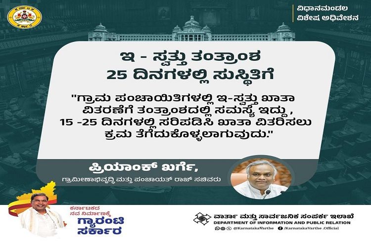 ಬೆಂಗಳೂರು : ಗ್ರಾಮ ಪಂಚಾಯಿತಿಗಳಲ್ಲಿ ಇ-ಸ್ವತ್ತು ಖಾತಾ ವಿತರಣೆಗೆ ತಂತ್ರಾಂಶದಲ್ಲಿ ಸಮಸ್ಯೆ ಇದ್ದು, 15 -25 ದಿನಗಳಲ್ಲಿ ಸರಿಪಡಿಸಿ ಖಾತಾ ವಿತರಿಸಲು ಕ್ರಮ ತೆಗೆದುಕೊಳ್ಳಲಾಗುವುದು ಎಂದು ಸಚಿವ ಪ್ರಿಯಾಂಕ್ ಖರ್ಗೆ ತಿಳಿಸಿದ್ದಾರೆ. ಬಿಜೆಪಿಯ ಕಿರಣ್ ಕುಮಾರ್ ಕೊಡ್ಲಿ ಅವರ ಪ್ರಶ್ನೆಗೆ ಉತ್ತರಿಸಿದ ಅವರು,ಗ್ರಾಮೀಣಾಭಿವೃದ್ಧಿ ಮತ್ತು ಪಂಚಾಯತ್ ರಾಜ್ ಇಲಾಖೆಯು ಗ್ರಾಮೀಣ ಭಾಗದ ಆಸ್ತಿಗಳನ್ನು ಡಿಜಿಟಲೀಕರಣ ಮಾಡಿ ಸಾರ್ವಜನಿಕರಿಗೆ ಸುಲಭವಾಗಿ ಇ-ಖಾತಾ ಸೌಲಭ್ಯ ದೊರಕುವಂತೆ ಮಾಡಬೇಕು ಎಂಬ ಉದ್ದೇಶದಿಂದ ಇ-ಸ್ವತ್ತು ಅಭಿಯಾನದಡಿ ಇ-ಸ್ವತ್ತು ತಂತ್ರಾಂಶ 2.0 ಅನ್ನು ಆರಂಭಿಸಿದೆ. ಈ ನೂತನ ಇ-ಸ್ವತ್ತು ತಂತ್ರಾಂಶ 2.0 ಅನ್ನು ಕಳೆದ ಡಿಸೆಂಬರ್ ನಲ್ಲಿ ಪ್ರಾರಂಭಿಸಲಾಗಿದೆ. ಕಳೆದ ಎರಡು ತಿಂಗಳುಗಳಲ್ಲಿ ಇ-ಸ್ವತ್ತು ತಂತ್ರಾಂಶ 1.0 & 2.0 ನಲ್ಲಿ 44,508 ಅರ್ಜಿಗಳ ಸ್ವೀಕೃತ ಮಾಡಲಾಗಿದೆ. ಅದರಲ್ಲಿ 7,978 ಅರ್ಜಿಗಳನ್ನು ಅನುಮೋದನೆ ಮಾಡಲಾಗಿದೆ. ಈ ತಂತ್ರಾಂಶದಲ್ಲಿ ಲೋಪಗಳನ್ನು ಬರುತ್ತಿದ್ದು, ಶೀಘ್ರದಲ್ಲಿಯೇ ಸರಿಪಡಿಸಲಾಗುವುದು. ನಾವು ಯಾವುದೇ ತಂತ್ರಾಂಶವನ್ನು ಅನುಷ್ಠಾನಕ್ಕೆ ತರಬೇಕು ಎಂದರೆ ಅದಕ್ಕಾಗಿ ನಾವು ಕೇಂದ್ರ ಸರ್ಕಾರದ ರಾಷ್ಟ್ರೀಯ…