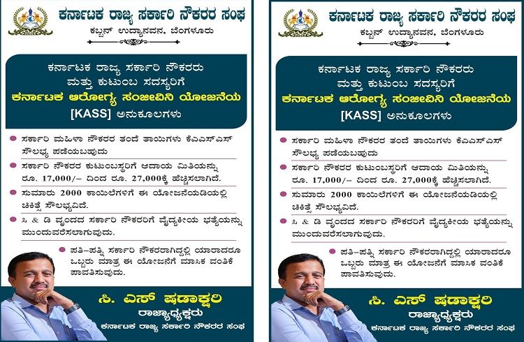 ಬೆಂಗಳೂರು : ಕರ್ನಾಟಕ ರಾಜ್ಯ ಸರ್ಕಾರಿ ನೌಕರರಿಗೆ ಹಾಗೂ ಅವರ ಕುಟುಂಬದ ಅವಲಂಬಿತ ಸದಸ್ಯರಿಗೆ ನಗದುರಹಿತ ವೈದ್ಯಕೀಯ ಚಿಕಿತ್ಸೆಗಳನ್ನು ಒದಗಿಸಲು ರಾಜ್ಯ ಸರ್ಕಾರದಿಂದ ರೂಪಿಸಲಾಗಿರುವ ‘ಕರ್ನಾಟಕ ಆರೋಗ್ಯ ಸಂಜೀವಿನಿ ಯೋಜನೆ’ (KASS) ಯನ್ನು ಅಕ್ಟೋಬರ್ 01, 2025 ರಿಂದ ಜಾರಿಗೆ ರಾಜ್ಯ ಸರ್ಕಾರ ಮಹತ್ವದ ಆದೇಶ ಹೊರಡಿಸಿದೆ. ರಾಜ್ಯ ಸರ್ಕಾರಿ ನೌಕರರಿಗೆ ಹಾಗೂ ಅವರ ಅವಲಂಬಿತ ಕುಟುಂಬದ ಸದಸ್ಯರಿಗೆ ನಗದು ರಹಿತ ವೈದ್ಯಕೀಯ ಚಿಕಿತ್ಸೆಗಳನ್ನು ಒದಗಿಸಲು ರಾಜ್ಯ ಸರ್ಕಾರದಿಂದ ಕರ್ನಾಟಕ ಆರೋಗ್ಯ ಸಂಜೀವಿನಿ ಯೋಜನೆಯನ್ನು (KASS) ಅನುಷ್ಠಾನಗೊಳಿಸುವ ಸಂಬಂಧ ಮೇಲೆ ಕ್ರ.ಸಂ.(1) ರಿಂದ (6) ರಲ್ಲಿ ಓದಲಾದ ಸರ್ಕಾರದ ಆದೇಶ: ಸುತ್ತೋಲೆಗಳಲ್ಲಿ ಕೆಲವು ಕಾರ್ಯನೀತಿ ಸೂಚನೆಗಳನ್ನು ನೀಡಲಾಗಿದೆ. ಕರ್ನಾಟಕ ರಾಜ್ಯ ಸರ್ಕಾರಿ ನೌಕರರು ಮತ್ತು ಕುಟುಂಬ ಸದಸ್ಯರಿಗೆ ಕರ್ನಾಟಕ ಆರೋಗ್ಯ ಸಂಜೀವಿನಿ ಯೋಜನೆಯ [KASS] ಅನುಕೂಲಗಳು ಸರ್ಕಾರಿ ಮಹಿಳಾ ನೌಕರರ ತಂದೆ ತಾಯಿಗಳು ಕೆಎಎಸ್ಎಸ್ ಸೌಲಭ್ಯ ಪಡೆಯಬಹುದು ಸರ್ಕಾರಿ ನೌಕರರ ಕುಟುಂಬಸ್ಥರಿಗೆ ಆದಾಯ ಮಿತಿಯನ್ನು 5. 17,000/- 2 5. 27,000₫…