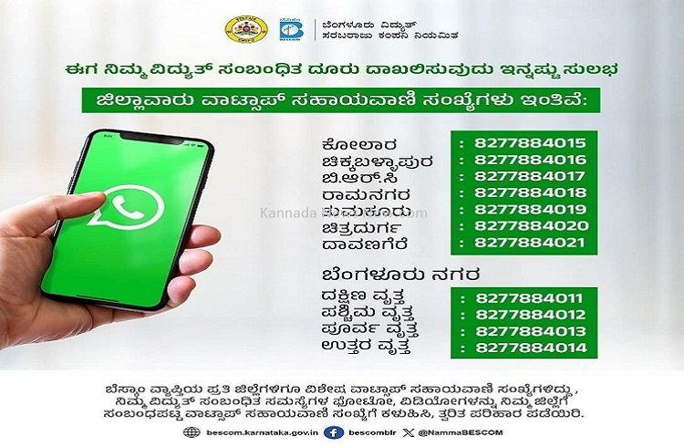 ಬೆಂಗಳೂರು : ರಾಜ್ಯದ ಜನರೇ ಗಮನಿಸಿ, ನಿಮ್ಮ ಊರಿನಲ್ಲಿ ವಿದ್ಯುತ್ ಸಮಸ್ಯೆಗಳಿದ್ರೆ ಪರಿಹಾರಕ್ಕೆ ಬೆಸ್ಕಾಂ ಸಹಾಯವಾಣಿ ಸಂಖ್ಯೆಗೆ ಕರೆ ಮಾಡಿ. ನಿಮ್ಮ ವಿದ್ಯುತ್ ಸಂಬಂಧಿತ ಸಮಸ್ಯೆಗಳ ಫೋಟೋ ಅಥವಾ ವಿಡಿಯೋಗಳನ್ನು ನಿಮ್ಮ ಜಿಲ್ಲೆಗೆ ಸಂಬಂಧಪಟ್ಟ ವಾಟ್ಸ್ಆ್ಯಪ್ ಸಹಾಯವಾಣಿ ಸಂಖ್ಯೆಗೆ ಕಳುಹಿಸಿ, ತ್ವರಿತ ಪರಿಹರ ಪಡೆಯಿರಿ. ಹೆಚ್ಚಿನ ಮಾಹಿತಿಗಾಗಿ ಬೆಸ್ಕಾಂ ಸಹಾಯವಾಣಿ 1912ಕ್ಕೆ ಕರೆಮಾಡಿ. ಜಿಲ್ಲಾವಾರು ವಾಟ್ಸಾಪ್ ಸಹಾಯವಾಣಿ ಸಂಖ್ಯೆಗಳು ಇಂತಿವೆ: ಕೋಲಾರ : 8277884015 ಚಿಕ್ಕಬಳ್ಳಾಪುರ : 8277884016 ಬಿ.ಆರ್.ಸಿ : 8277884017 ರಾಮನಗರ : 8277884018 ತುಮಕೂರು : 8277884019 ಚಿತ್ರದುರ್ಗ : 8277884020 ದಾವಣಗೆರೆ : 8277884021 ಬೆಂಗಳೂರು ನಗರ ದಕ್ಷಿಣ ವೃತ್ತ : 8277884011 ಪಶ್ಚಿಮ ವೃತ್ತ : 8277884012 ಪೂರ್ವ ವೃತ್ತ : 8277884013 ಉತ್ತರ ವೃತ್ತ : 8277884014