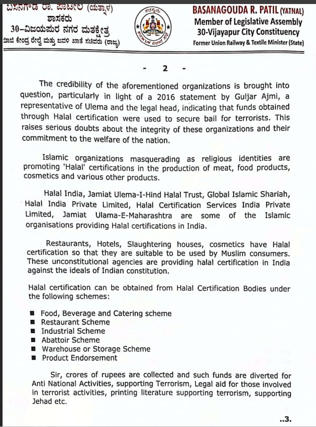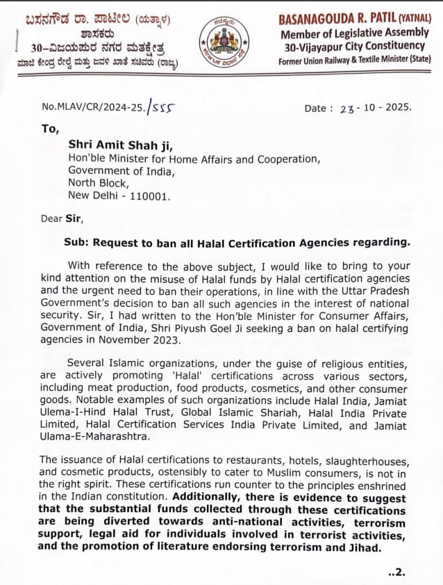 ಕರ್ನಾಟಕದಲ್ಲಿ ಹಲಾಲ್ ಸರ್ಟಿಫಿಕೇಟ್ ನಿಂದ ಕೆಲ ಸಂಘಟನೆಗಳು ಹಣ ದುರ್ಬಳಕೆ ಮಾಡ್ತಿವೆ. ಹೀಗಾಗಿ ಹಲಾಲ್ ಸರ್ಟಿಫಿಕೇಟ್ ನಿಷೇಧ ಮಾಡುವಂತೆ ಕೇಂದ್ರ ಗೃಹ ಸಚಿವ ಅಮಿತ್ ಶಾಗೆ ಶಾಸಕ ಬಸನಗೌಡ ಪಾಟೀಲ್ ಯತ್ನಾಳ್ ಪತ್ರ ಬರೆದು ಆಗ್ರಹಿಸಿದ್ದಾರೆ.