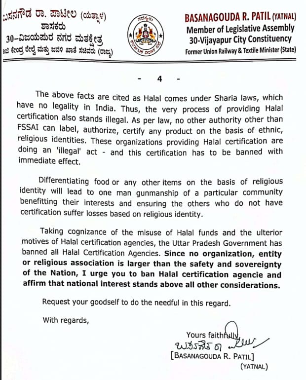 ರಾಷ್ಟ್ರೀಯ ಭದ್ರತೆಯ ಹಿತದೃಷ್ಟಿಯಿಂದ ಉತ್ತರ ಪ್ರದೇಶ ಸರ್ಕಾರವು ಅಂತಹ ಎಲ್ಲಾ ಸಂಸ್ಥೆಗಳನ್ನು ನಿಷೇಧಿಸುವ ನಿರ್ಧಾರಕ್ಕೆ ಅನುಗುಣವಾಗಿ, ಹಲಾಲ್ ಪ್ರಮಾಣೀಕರಣ ಸಂಸ್ಥೆಗಳಿಂದ ಹಲಾಲ್ ನಿಧಿಗಳ ದುರುಪಯೋಗ ಮತ್ತು ಅವುಗಳ ಕಾರ್ಯಾಚರಣೆಗಳನ್ನು ನಿಷೇಧಿಸುವ ತುರ್ತು ಅಗತ್ಯದ ಬಗ್ಗೆ ನಾನು ನಿಮ್ಮ ಗಮನಕ್ಕೆ ತರಲು ಬಯಸುತ್ತೇನೆ. ಸರ್, ನವೆಂಬರ್ 2023 ರಲ್ಲಿ ಹಲಾಲ್ ಪ್ರಮಾಣೀಕರಣ ಸಂಸ್ಥೆಗಳನ್ನು ನಿಷೇಧಿಸುವಂತೆ ಕೋರಿ ನಾನು ಭಾರತ ಸರ್ಕಾರದ ಗ್ರಾಹಕ ವ್ಯವಹಾರಗಳ ಸಚಿವ ಪಿಯೂಷ್ ಗೋಯೆಲ್ ಜಿ ಅವರಿಗೆ ಪತ್ರ ಬರೆದಿದ್ದೆ ಎಂದಿದ್ದಾರೆ.