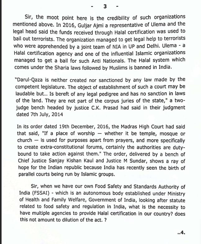 ಮುಸ್ಲಿಂ ಗ್ರಾಹಕರನ್ನು ಗಮನದಲ್ಲಿಟ್ಟುಕೊಂಡು ರೆಸ್ಟೋರೆಂಟ್ಗಳು, ಹೋಟೆಲ್ಗಳು, ಕಸಾಯಿಖಾನೆಗಳು ಮತ್ತು ಸೌಂದರ್ಯವರ್ಧಕ ಉತ್ಪನ್ನಗಳಿಗೆ ಹಲಾಲ್ ಪ್ರಮಾಣೀಕರಣಗಳನ್ನು ನೀಡುವುದು ಸರಿಯಾದ ಮನೋಭಾವದಿಂದಲ್ಲ. ಈ ಪ್ರಮಾಣೀಕರಣಗಳು ಭಾರತೀಯ ಸಂವಿಧಾನದಲ್ಲಿ ಪ್ರತಿಪಾದಿಸಲಾದ ತತ್ವಗಳಿಗೆ ವಿರುದ್ಧವಾಗಿವೆ.