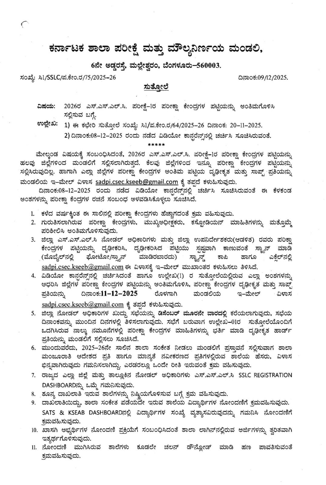 ಮೇಲ್ಕಂಡ ವಿಷಯಕ್ಕೆ ಸಂಬಂಧಿಸಿದಂತೆ, 2026ರ ಎಸ್.ಎಸ್.ಎಲ್.ಸಿ. ಪರೀಕ್ಷೆ-1ರ ಪರೀಕ್ಷಾ ಕೇಂದ್ರಗಳ ಪಟ್ಟಿಯನ್ನು ಹಲವು ಜಿಲ್ಲೆಗಳಿಂದ ಮಂಡಲಿಗೆ ಸಲ್ಲಿಸಲಾಗಿರುತ್ತದೆ. ಕೆಲವು ಜಿಲ್ಲೆಗಳಿಂದ ಇನ್ನೂ ಪರೀಕ್ಷಾ ಕೇಂದ್ರಗಳ ಪಟ್ಟಿಯನ್ನು ಸಲ್ಲಿಸಿರುವುದಿಲ್ಲ. ಹಾಗಾಗಿ ಎಲ್ಲಾ ಜಿಲ್ಲೆಗಳ ಪರೀಕ್ಷಾ ಕೇಂದ್ರಗಳ ಅಂತಿಮ ಪಟ್ಟಿಯ ದೃಢೀಕೃತ ಮತ್ತು ಸಾಪ್ಟ್ ಪ್ರತಿಯನ್ನು ಮಂಡಲಿಯ ಇ-ಮೇಲ್ ವಿಳಾಸ sadpi.csec.kseeb@gmail.com ಕ್ಕೆ ತಪ್ಪದೆ ಕಳುಹಿಸುವುದು.