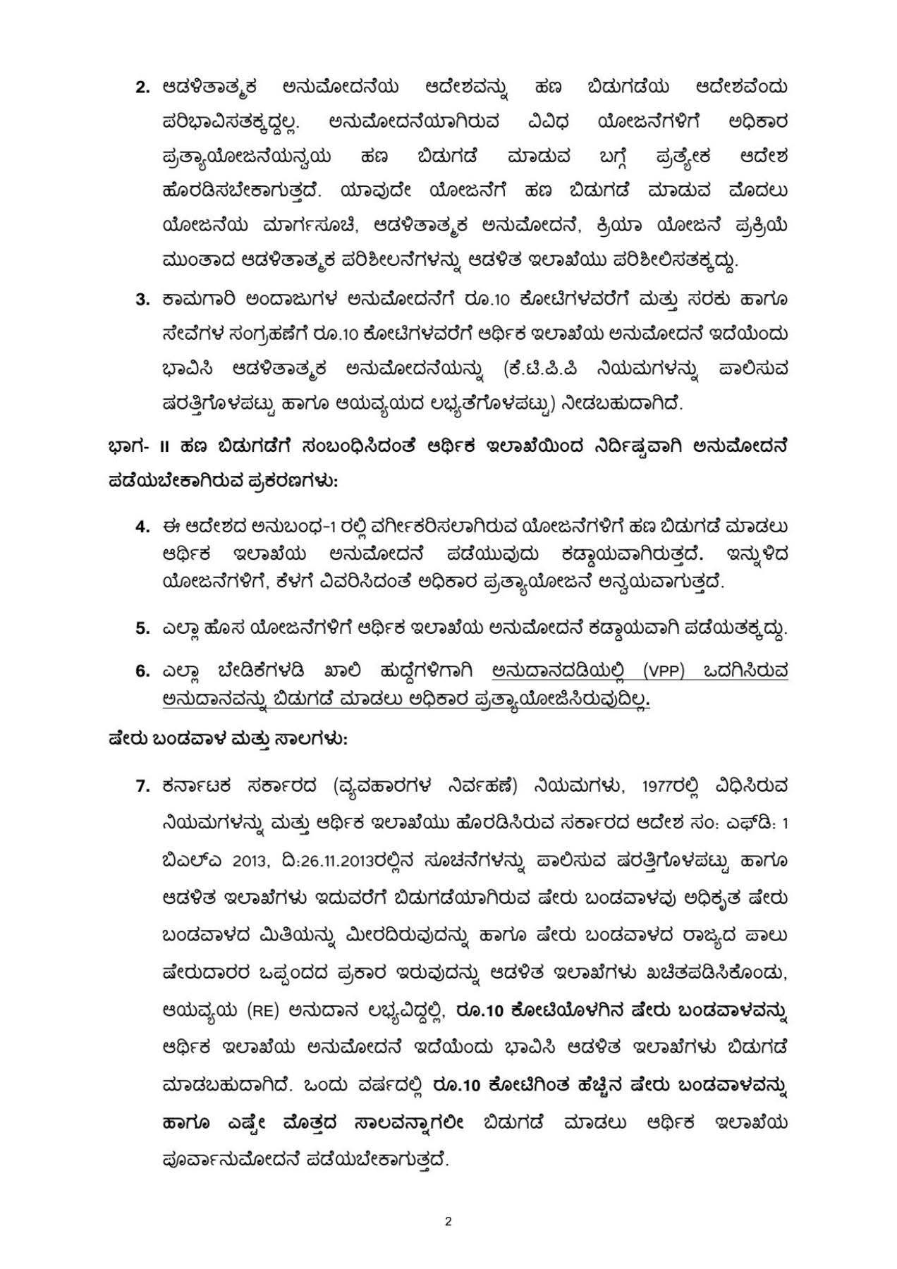 ಈ ಆದೇಶದ ಅನುಬಂಧ-1 ರಲ್ಲಿ ವರ್ಗೀಕರಿಸಲಾಗಿರುವ ಯೋಜನೆಗಳಿಗೆ ಹಣ ಬಿಡುಗಡೆ ಮಾಡಲು ಆರ್ಥಿಕ ಇಲಾಖೆಯ ಅನುಮೋದನೆ ಪಡೆಯುವುದು ಕಡ್ಡಾಯವಾಗಿರುತ್ತದೆ. ಇನ್ನುಳಿದ ಯೋಜನೆಗಳಿಗೆ, ಕೆಳಗೆ ವಿವರಿಸಿದಂತೆ ಅಧಿಕಾರ ಪ್ರತ್ಯಾಯೋಜನೆ ಅನ್ವಯವಾಗುತ್ತದೆ.