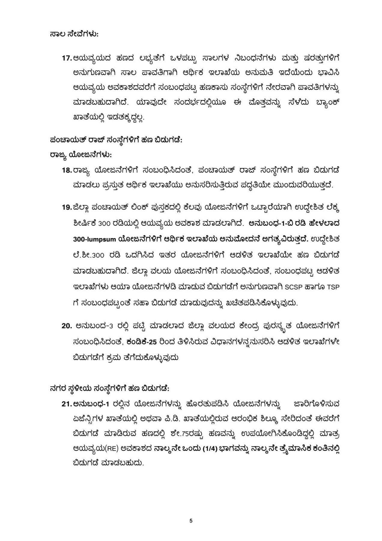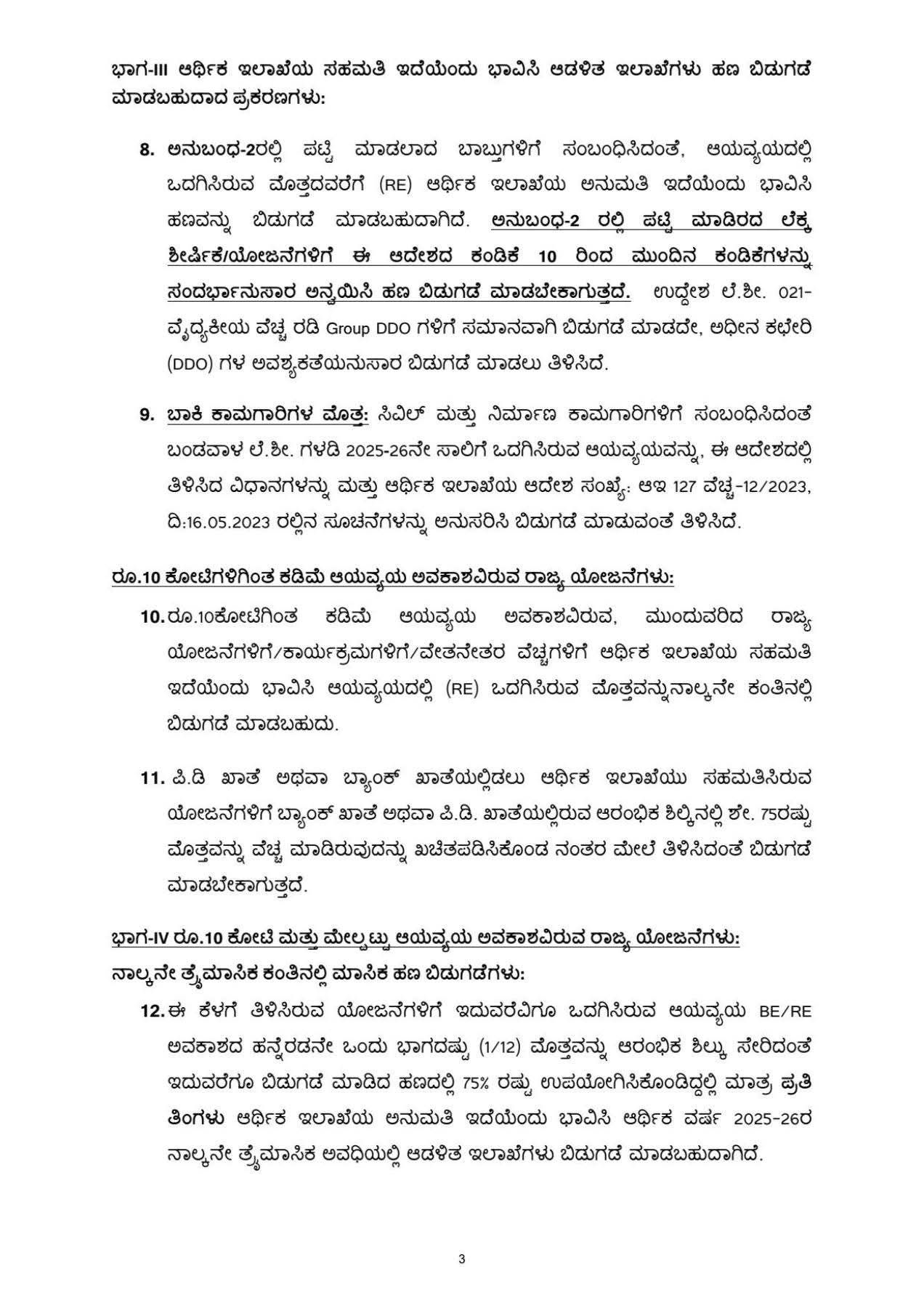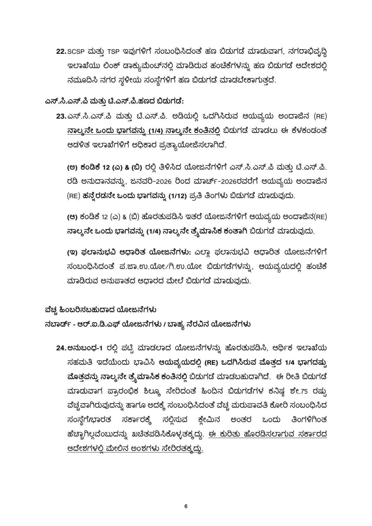ಈ ಕೆಳಗೆ ತಿಳಿಸಿರುವ ಯೋಜನೆಗಳಿಗೆ ಇದುವರೆವಿಗೂ ಒದಗಿಸಿರುವ ಆಯವ್ಯಯ BE/RE ಅವಕಾಶದ ಹನ್ನೆರಡನೇ ಒಂದು ಭಾಗದಷ್ಟು (1/12) ಮೊತ್ತವನ್ನು ಆರಂಭಿಕ ಶಿಲ್ಕು ಸೇರಿದಂತೆ ಇದುವರೆಗೂ ಬಿಡುಗಡೆ ಮಾಡಿದ ಹಣದಲ್ಲಿ 75% ರಷ್ಟು ಉಪಯೋಗಿಸಿಕೊಂಡಿದ್ದಲ್ಲಿ ಮಾತ್ರ ಪ್ರತಿ ತಿಂಗಳು ಆರ್ಥಿಕ ಇಲಾಖೆಯ ಅನುಮತಿ ಇದೆಯೆಂದು ಭಾವಿಸಿ ಆರ್ಥಿಕ ವರ್ಷ 2025-26ರ ನಾಲ್ಕನೇ ತ್ರೈಮಾಸಿಕ ಅವಧಿಯಲ್ಲಿ ಆಡಳಿತ ಇಲಾಖೆಗಳು ಬಿಡುಗಡೆ ಮಾಡಬಹುದಾಗಿದೆ.
