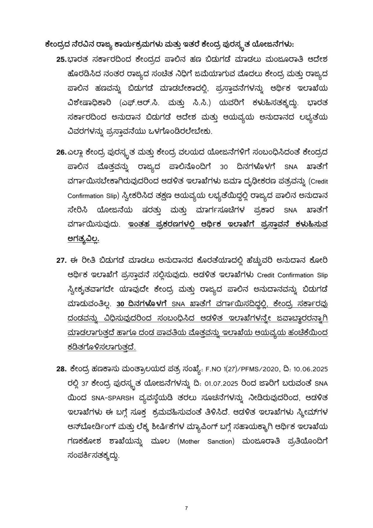 ಆಡಳಿತಾತ್ಮಕ ಅನುಮೋದನೆಯ ಆದೇಶವನ್ನು ಹಣ ಬಿಡುಗಡೆಯ ಆದೇಶವೆಂದು ಪರಿಭಾವಿಸತಕ್ಕದ್ದಲ್ಲ. ಅನುಮೋದನೆಯಾಗಿರುವ ವಿವಿಧ ಯೋಜನೆಗಳಿಗೆ ಅಧಿಕಾರ ಪ್ರತ್ಯಾಯೋಜನೆಯನ್ವಯ ಹಣ ಬಿಡುಗಡೆ ಮಾಡುವ ಬಗ್ಗೆ ಪ್ರತ್ಯೇಕ ಆದೇಶ ಹೊರಡಿಸಬೇಕಾಗುತ್ತದೆ. ಯಾವುದೇ ಯೋಜನೆಗೆ ಹಣ ಬಿಡುಗಡೆ ಮಾಡುವ ಮೊದಲು ಯೋಜನೆಯ ಮಾರ್ಗಸೂಚಿ, ಆಡಳಿತಾತ್ಮಕ ಅನುಮೋದನೆ, ಕ್ರಿಯಾ ಯೋಜನೆ ಪ್ರಕ್ರಿಯೆ ಮುಂತಾದ ಆಡಳಿತಾತ್ಮಕ ಪರಿಶೀಲನೆಗಳನ್ನು ಆಡಳಿತ ಇಲಾಖೆಯು ಪರಿಶೀಲಿಸತಕ್ಕದ್ದು.
