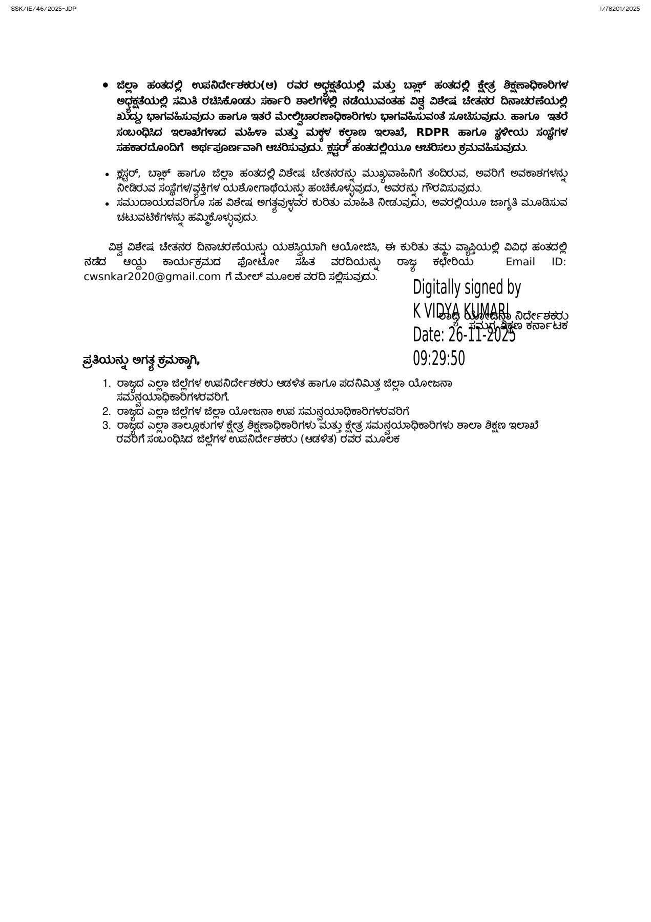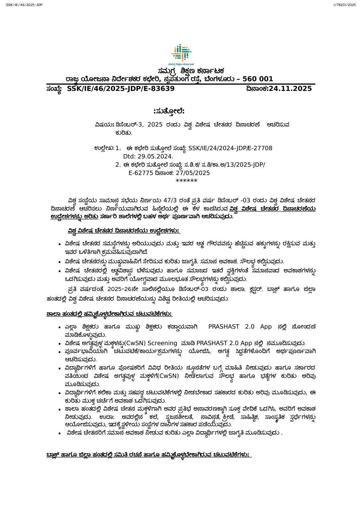 ಪ್ರತಿ ವರ್ಷದಂತೆ, 2025-26ನೇ ಸಾಲಿನಲ್ಲಿಯೂ ಡಿಸೆಂಬರ್-03 ರಂದು ಶಾಲಾ, ಕ್ಲಸ್ಟರ್, ಬ್ಲಾಕ್ ಹಾಗೂ ಜಿಲ್ಲಾ ಹಂತದಲ್ಲಿ ವಿಶ್ವ ವಿಶೇಷ ಚೇತನರ ದಿನಾಚರಣೆಯನ್ನು ವಿಶಿಷ್ಟ ರೀತಿಯಲ್ಲಿ ಆಚರಿಸುವುದು.