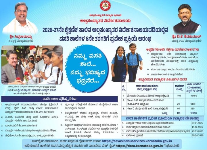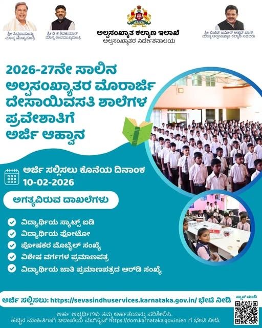 ಬೆಂಗಳೂರು : ಪೋಷಕರೇ ಗಮನಿಸಿ, 2026-27 ಅಲ್ಪಸಂಖ್ಯಾತರ ಮೊರಾರ್ಜಿ ದೇಸಾಯಿವಸತಿ ಶಾಲೆಗಳ ಪ್ರವೇಶಾತಿಗೆ ಅರ್ಜಿ ಆಹ್ವಾನಿಸಲಾಗಿದ್ದು, ಅರ್ಜಿ ಸಲ್ಲಿಸಲು ಕೊನೆಯ ದಿನಾಂಕ 10-02-2026 ಆಗಿದೆ.